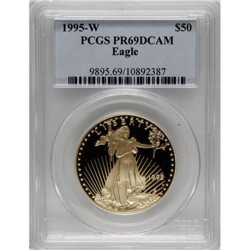 <B>1995-W G$50 One-Ounce Gold Eagle PR69 Deep Cameo PCGS.</B></I> PCGS Population (1190/36). NGC Census: (4892/1045). Numismedia Wsl. Price: $735. (#9895)<BR><BR><b>Shipping:</b> Coins & Currency (<a target="_blank" href="http://www.heritageauctions.com/common/shipping.php">view shipping information</a>)