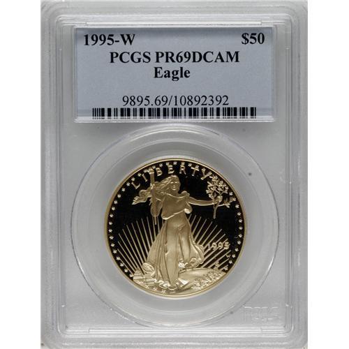<B>1995-W G$50 One-Ounce Gold Eagle PR69 Deep Cameo PCGS.</B></I> PCGS Population (1190/36). NGC Census: (4892/1045). Numismedia Wsl. Price: $735. (#9895)<BR><BR><b>Shipping:</b> Coins & Currency (<a target="_blank" href="http://www.heritageauctions.com/common/shipping.php">view shipping information</a>)
