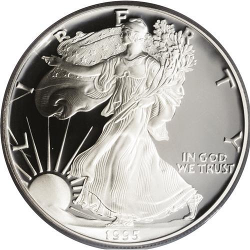 <B>1995-W<img border='0' src='http://www.heritagecoins.com/images/star.gif' width=10 height=10>$1> Silver Eagle PR69 Deep Cameo PCGS.</B></I> A glittering example of the well recognized key to the Silver Eagle series that has fabulous contrast between the frosty devices and the jet black fields. This specimen borders on perfection.