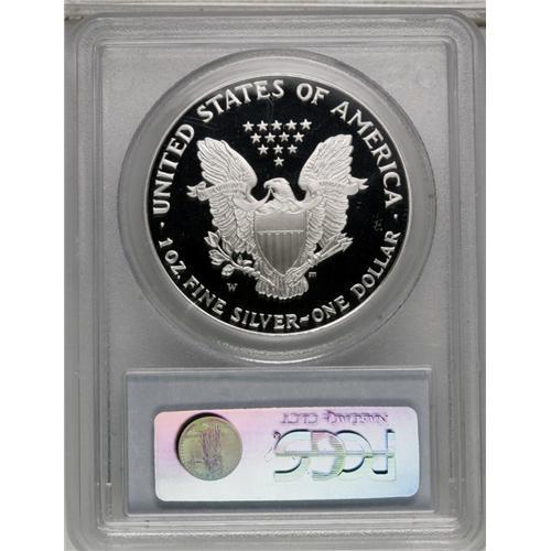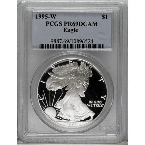 <B>1995-W S$1 Silver Eagle PR69 Deep Cameo PCGS.</B></I> A gorgeous white-on-black representative of this coveted low mintage issue. The strike is exemplary, and the preservation is pristine, although the plastic holder has minor marks that may unfairly reflect upon the mirrored fields. The unchallenged key to the silver eagle series.<BR><BR><b>Shipping:</b> Coins & Currency (<a target="_blank" href="http://www.heritageauctions.com/common/shipping.php">view shipping information</a>)