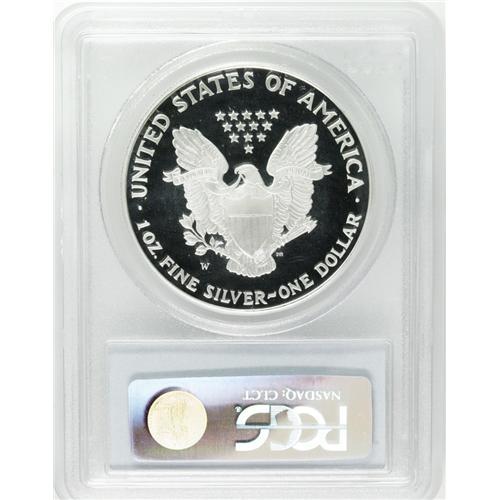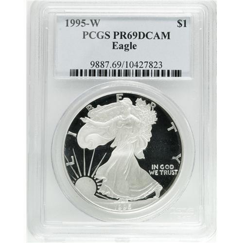 <B>1995-W S$1 Silver Eagle PR69 Deep Cameo PCGS.</B></I> A magnificent white-on-black example of this popular low mintage issue. Fully brilliant, and perfect save for a couple of pinpoint frost breaks on the Walking Liberty and a tiny lintmark near the WA initials. The 1995-W is the key to the proof Silver Eagle series, which is widely collected for its large diameter, silver content, and exceptional eye appeal.<BR><BR><b>Shipping:</b> Coin/Currency (<a target="_blank" href="http://www.heritageauctions.com/common/shipping.php">view shipping information</a>)