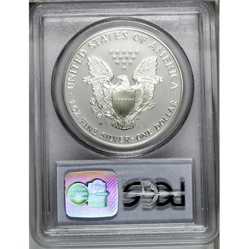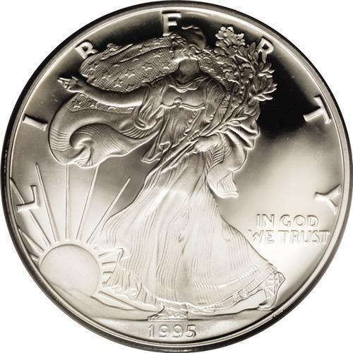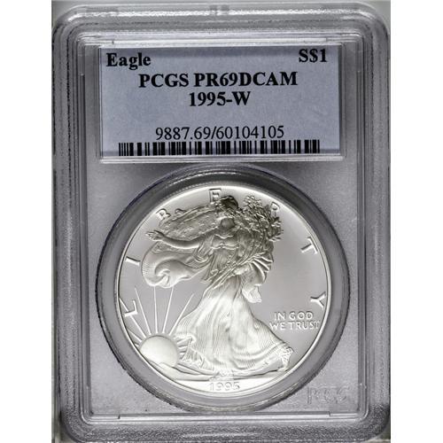 <B>1995-W<img border='0' src='http://www.heritagecoins.com/images/star.gif' width=10 height=10>$1> Silver Eagle PR69 Deep Cameo PCGS.</B></I> Essentially perfect with highly lustrous devices framed by deeply mirrored fields. This is the key-date issue in the series of proof silver Eagles. <BR><BR><B>Important notice:</B> Heritage usually auctions material at the rate of 200-250 lots per hour. On some occasions eBay Live bid software or the Internet may not be able to keep up with the pace of the auction. We recommend placing a realistic absentee bid now as insurance to avoid disappointment. Occasionally the auctioneer may eliminate or reject an eBay Live bid, and the auctioneer may also reopen a lot after the close of the eBay live bidding (usually because we missed an audience bid), and may reject your bid even if it shows you as the winning bidder. By bidding via eBay Live, you agree that Heritage may award the lot to another bidder at its sole discretion under the circumstances described above or any other reasonable circumstances. Since eBay bids are not shown to us until we open the lot on the floor, we treat those bids just like floor bids. In most cases the floor responds before the eBay bid is presented to us, due to Internet lag time, so for consistency we have made it a policy that floor bids are always considered first over tie eBay live bids. Also please note that all Heritage lots purchased through eBay Live carry a 20% Buyer's Premium. Please make sure you read the Terms and Conditions before you bid. This lot is being auctioned in conjunction with a live floor auction by Heritage Galleries & Auctioneers. All final auction and invoice information will be supplied by Heritage Galleries & Auctioneers, and all other information should be considered preliminary. Lot:5210 <BR><BR><B>Winning Notification and Billing:</B> After the FINAL session in this auction is complete, Heritage will send e-mail and snail mail invoices. This process normally takes several days. All final auction and invoice information will be supplied by Heritage Galleries & Auctioneers, and all other information should be considered preliminary. <BR><BR>This auction will be conducted on a live auction floor and over the Internet through eBay Live. If you choose to place an absentee bid, please take a moment to <font color='#0000ff'><u><a href='http://pages.ebay.com/liveauctions/help/before/laabsentee.html'>learn how eBay Live absentee bidding works</a></u></font><font color='#000000'>