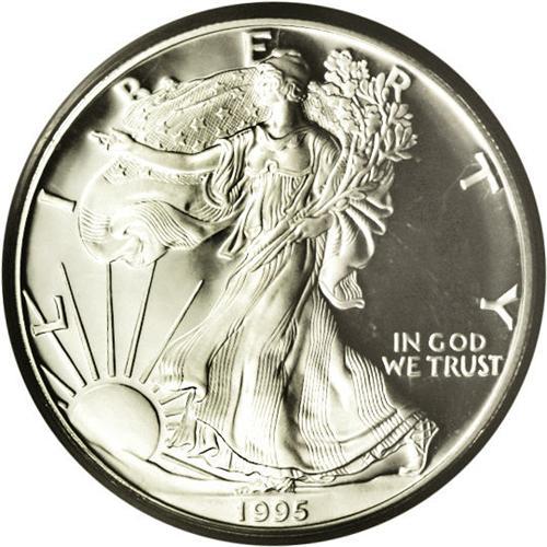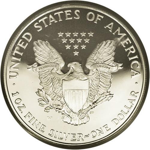 <B>1995-W<img border='0' src='http://www.heritagecoins.com/images/star.gif' width=10 height=10>$1> Silver Eagle PR69 Deep Cameo PCGS.</B></I> With just 30,125 pieces produced, the '95-W is the key issue in the modern Silver Eagle set. This is a gorgeous Superb Gem with starkly cameoed surfaces that are devoid of both toning and distracting blemishes. Fully struck, as expected.