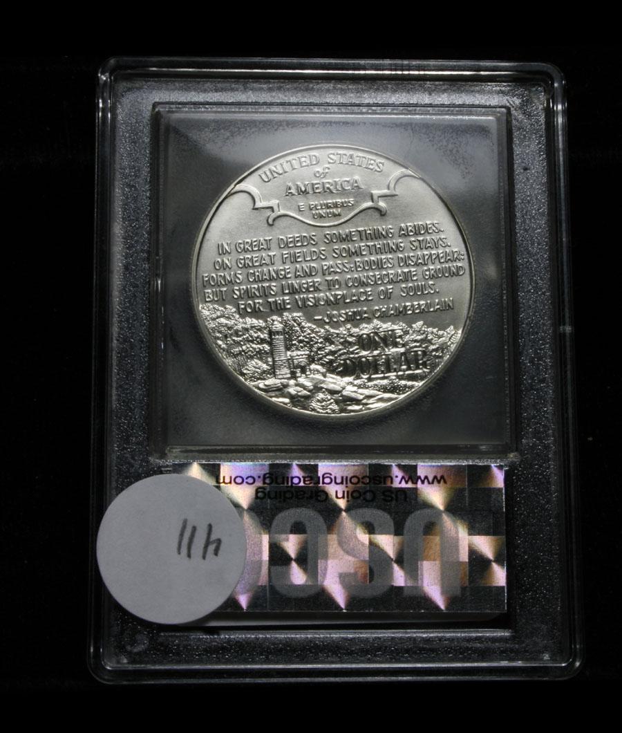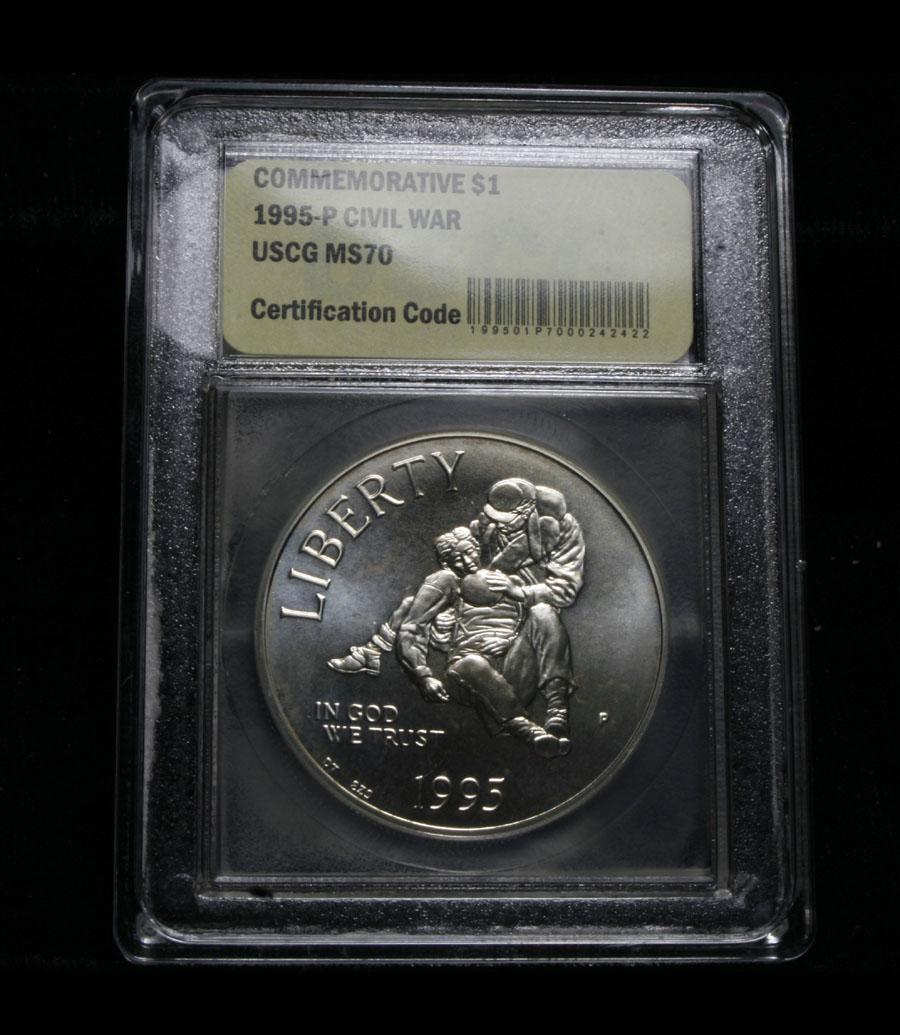 The 1995 Civil War Battlefields Silver Dollar was to commemorative 100 years of Civil War battlefields preservation. This is dated from the establishment of the Gettysburg National Military Park in 1895. Encapsulated and Graded ms70 by USCG. PCGS lists the ms70 at $750. Estimated Value $200.