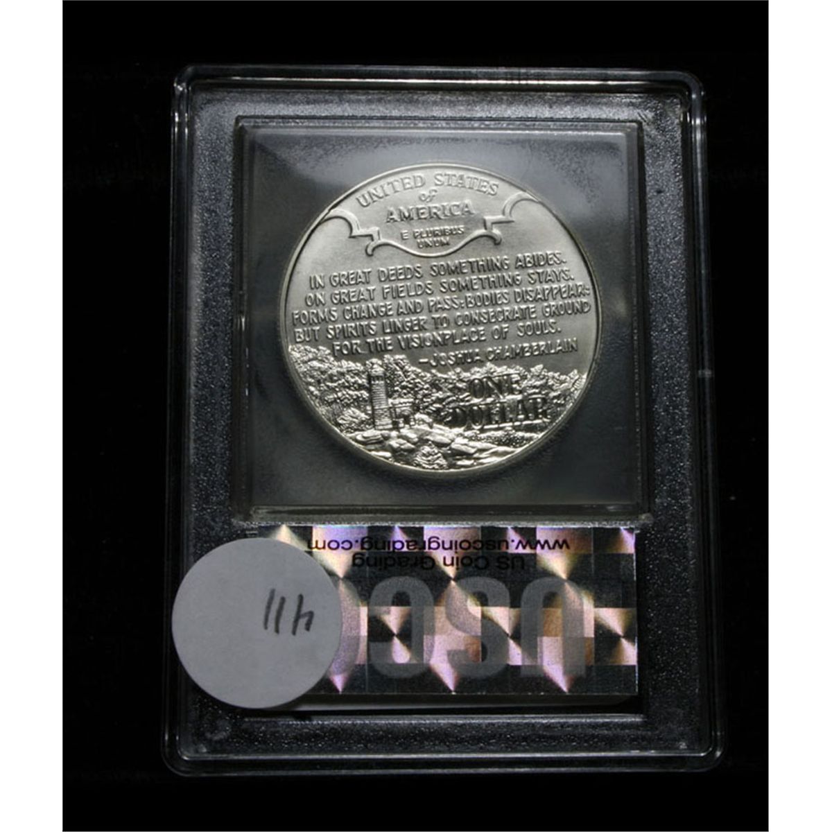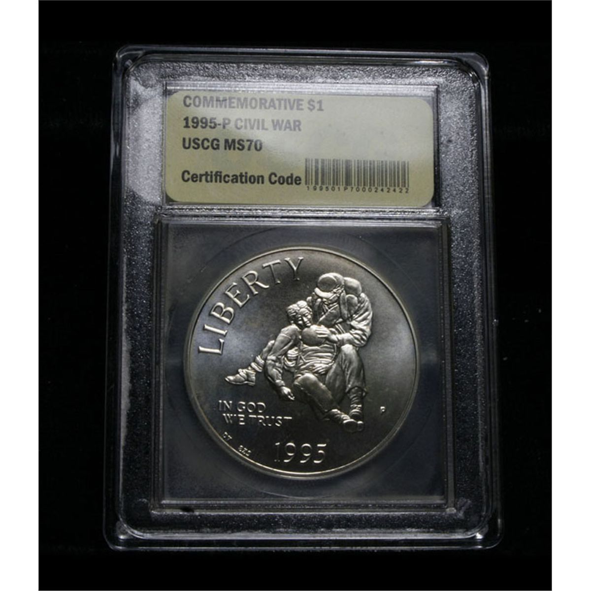 The 1995 Civil War Battlefields Silver Dollar was to commemorative 100 years of Civil War battlefields preservation. This is dated from the establishment of the Gettysburg National Military Park in 1895. Encapsulated and Graded ms70 by USCG. PCGS lists the ms70 at $750. Estimated Value $200.