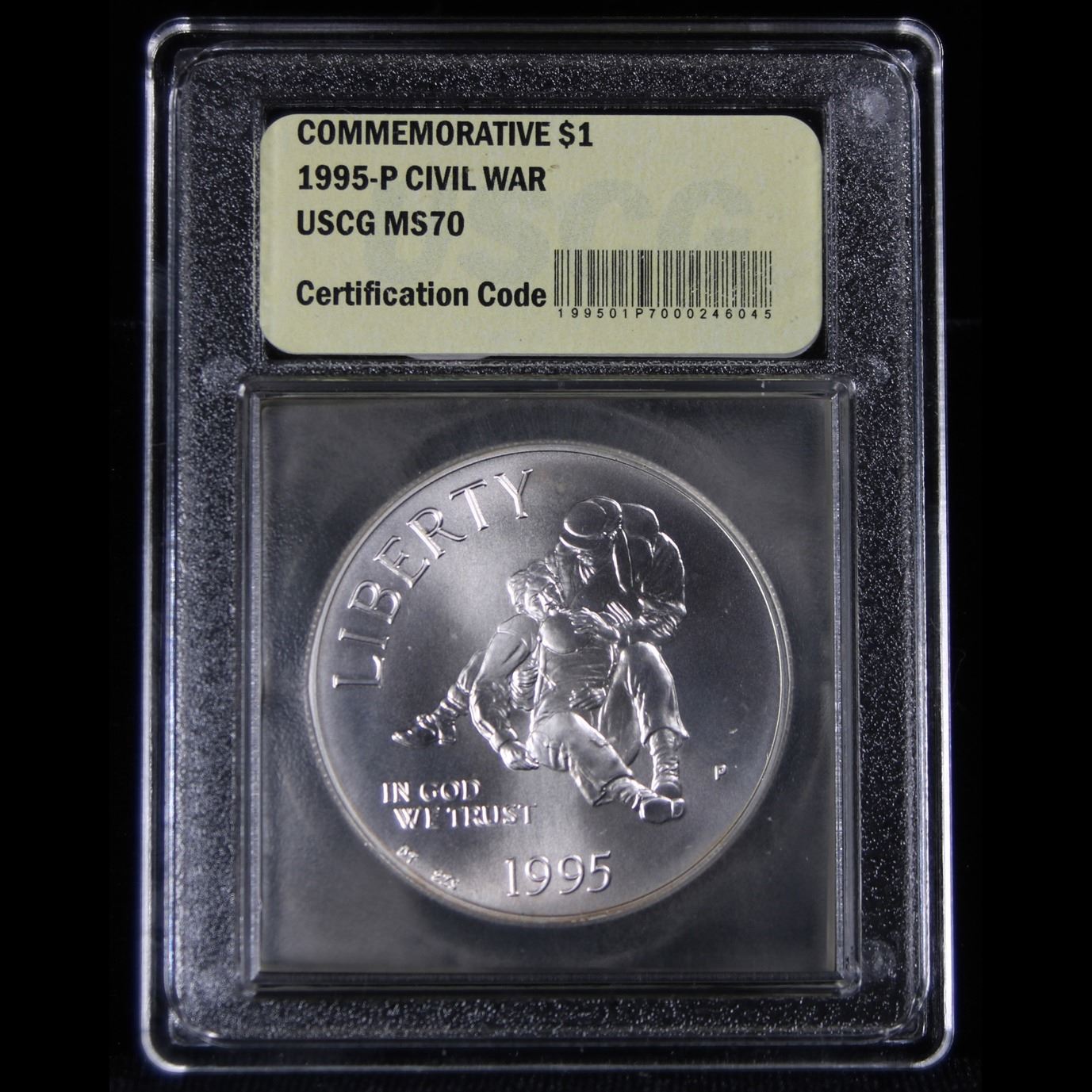 1995-p Civil War Modern Commem Dollar $1 Graded ms70, Perfection By USCG. The 1995 Civil War Battlefields Silver Dollar was to commemorate 100 years of Civil War battlefields preservation. This is dated from the establishment of the Gettysburg National Military Park in 1895. Encapsulated and Graded Perfection Gem+++ Uncirculated by USCG.