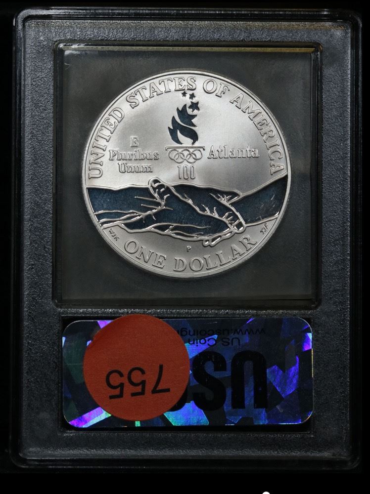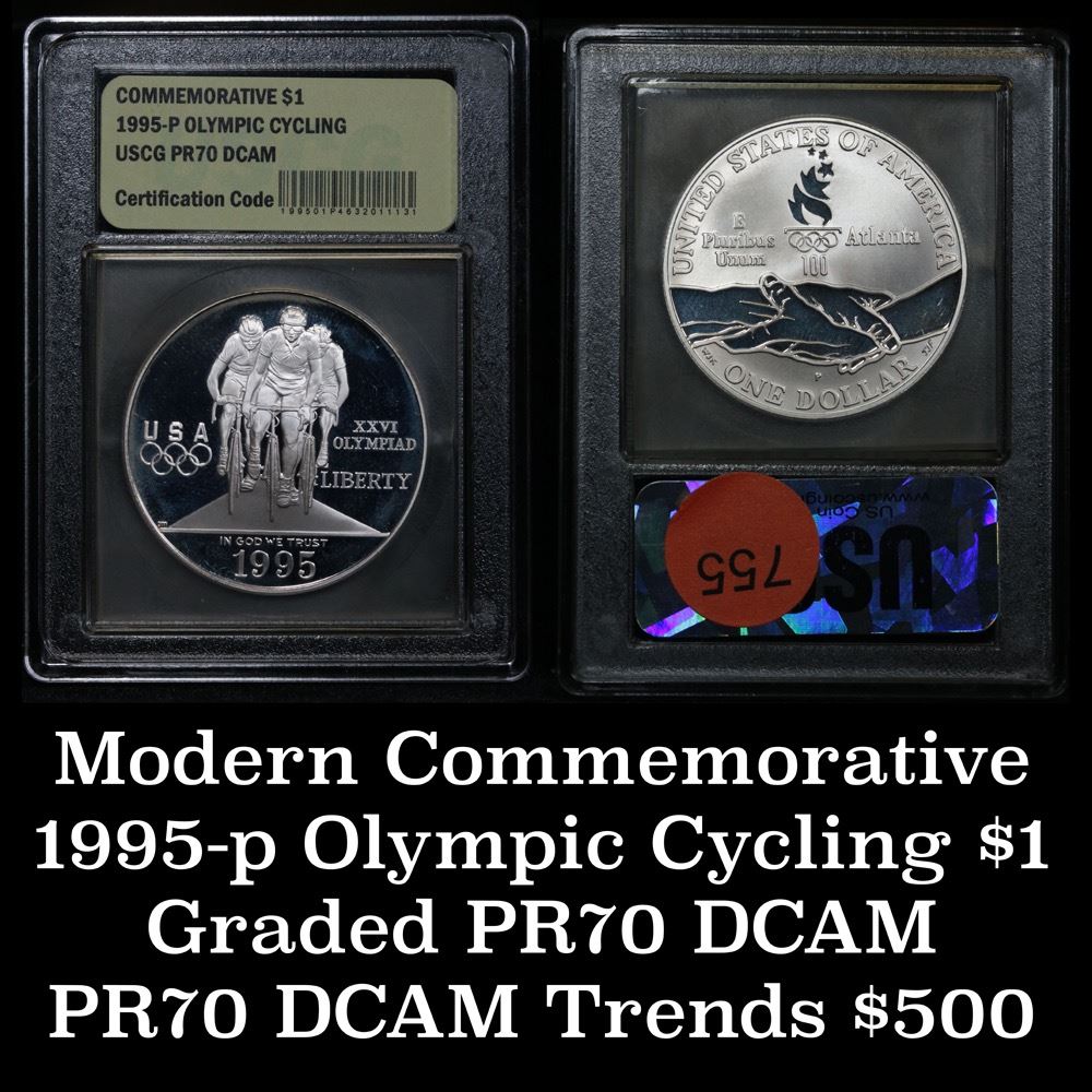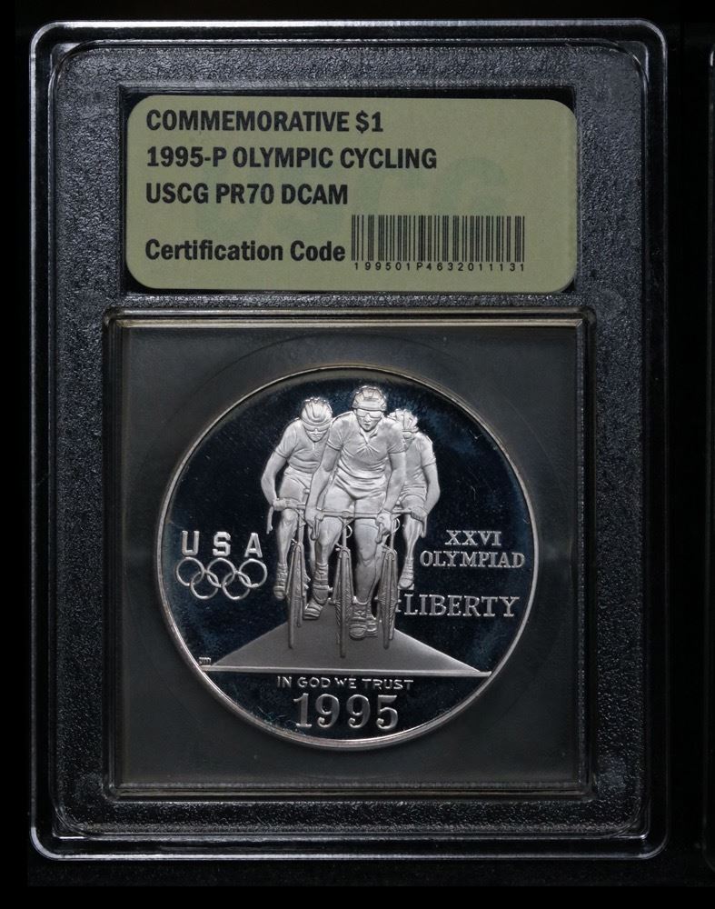 1995-p Olympic Cycling Proof Modern Commem Dollar $1 Grades GEM++ Proof Deep Cameo. The 1995 Olympic Cycling Silver Dollar was issued as part of an extensive program of commemorative coins for the XXVI Olympiad held in Atlanta, Georgia. There were a total of sixteen different coins issued for the program over the course of two years. PCGS calls this grade elusive. This Perfect coin is graded Gem+++ Proof Deep cameo by USCG. Estimated Value $500.