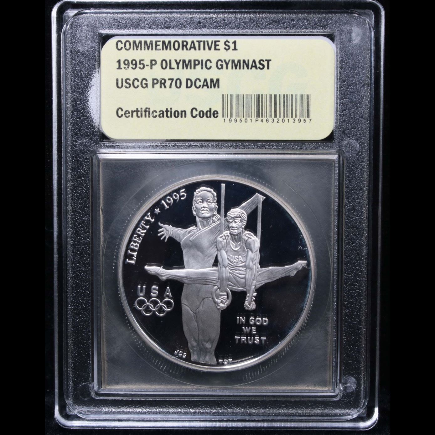 1995-p Olympic Gymnast Commem Proof Silver Dollar Modern Commem Dollar $1 Graded GEM++ Proof Deep Cameo by USCG. The 1995 Olympic Gymnast Silver Dollar was issued as part of an extensive program of commemorative coins for the XXVI Olympiad held in Atlanta, Georgia. There were a total of sixteen different coins issued for the program over the course of two years. This coin is graded perfection by USCG.