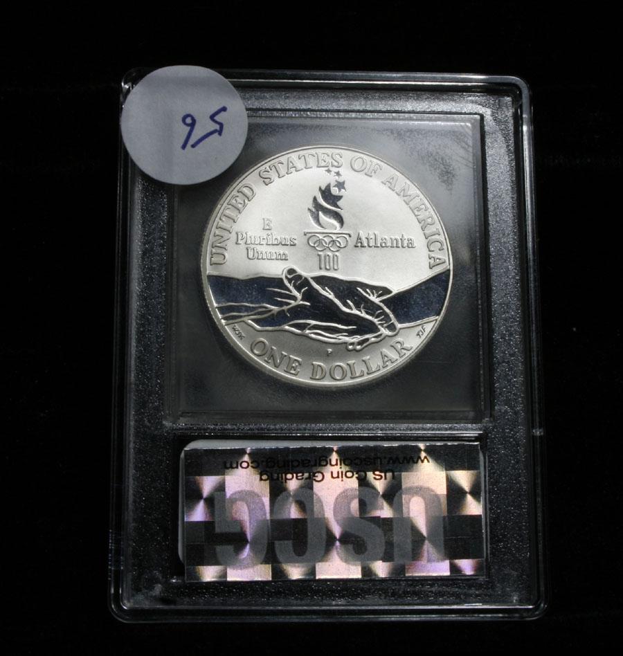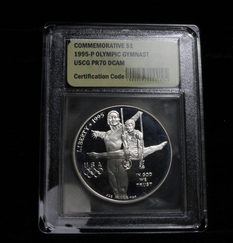 The 1995 Olympic Gymnast Silver Dollar was issued was part of an extensive program of commemorative coins for the XXVI Olympiad held in Atlanta, Georgia. There were a total of sixteen different coins issued for the program over the course of two years. PCGS lists PR70 DCAM as $2600, elusive. This Perfect coin is graded PR70 Deep cameo by USCG. PCGS list PR70 at $1250. Estimated Value $250.