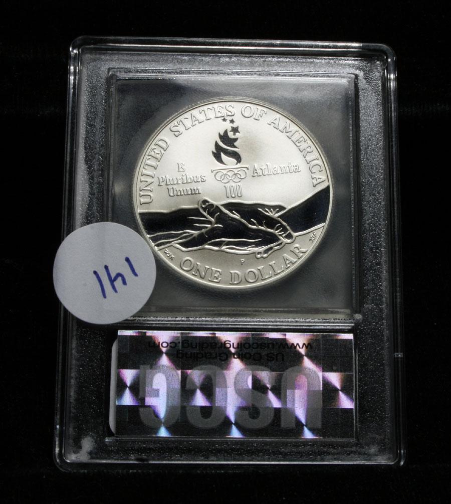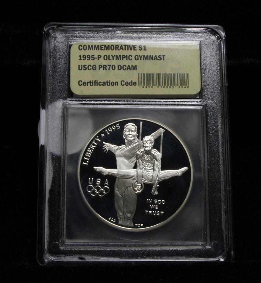 The 1995 Olympic Gymnast Silver Dollar was issued was part of an extensive program of commemorative coins for the XXVI Olympiad held in Atlanta, Georgia. There were a total of sixteen different coins issued for the program over the course of two years. This Perfect coin is graded PR70 Deep cameo by USCG. PCGS list PR70 at $1250. Estimated Value $250.