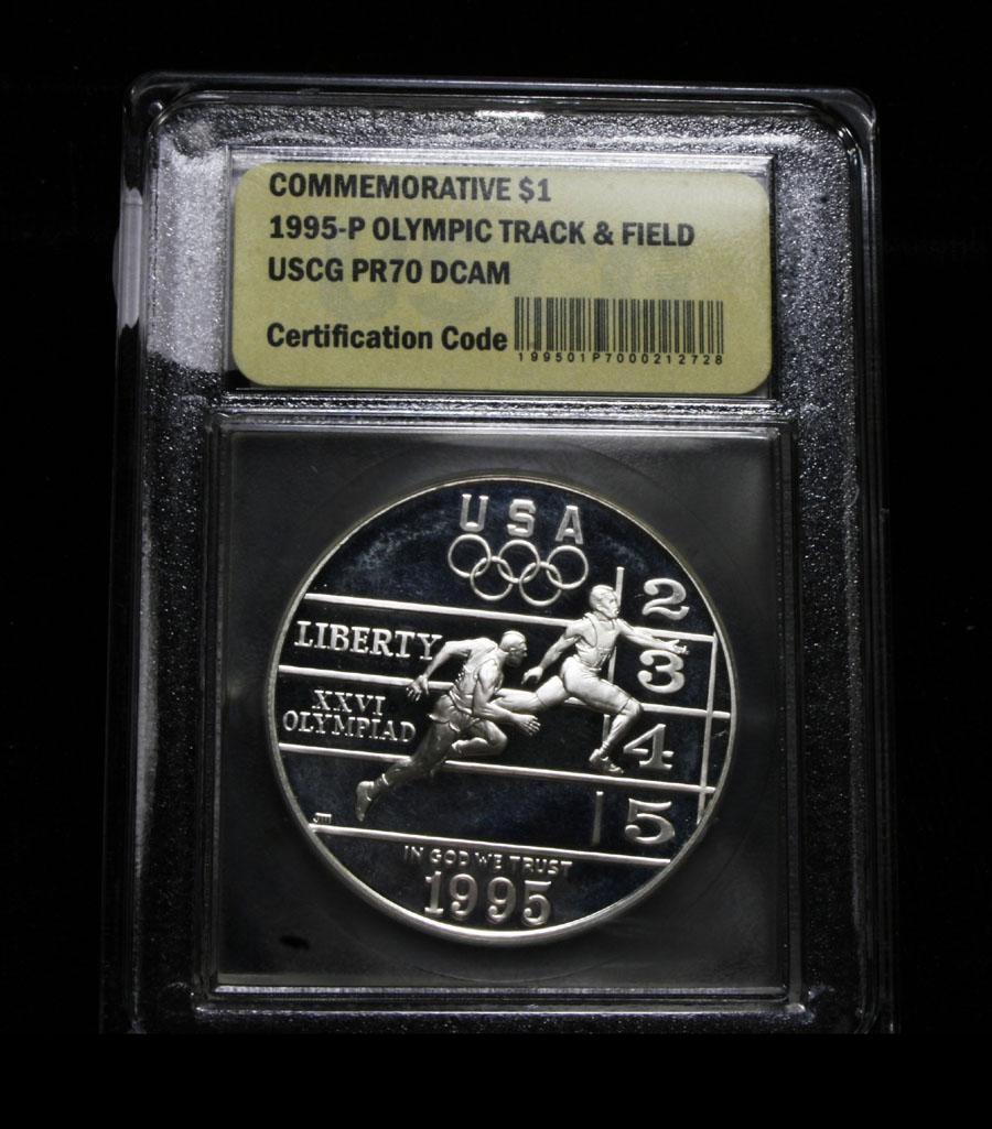 The 1995 Olympic Track and Field Silver Dollar was issued was part of an extensive program of commemorative coins for the XXVI Olympiad held in Atlanta, Georgia. There were a total of sixteen different coins issued for the program over the course of two years. PCGS lists PR70 DCAM as $2250, Elusive. This Perfect coin is graded PR70 Deep cameo by USCG. Estimated Value $450.