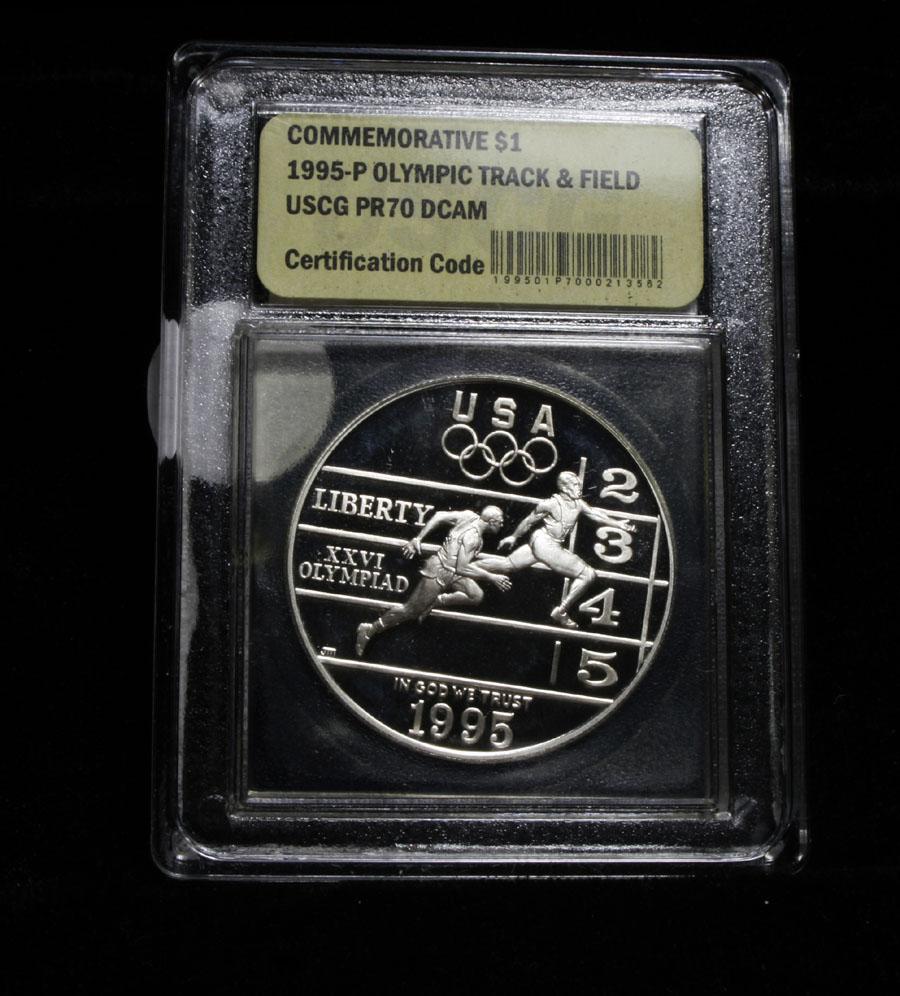 The 1995 Olympic Track and Field Silver Dollar was issued was part of an extensive program of commemorative coins for the XXVI Olympiad held in Atlanta, Georgia. There were a total of sixteen different coins issued for the program over the course of two years. PCGS lists PR70 DCAM as $2250, Elusive. This Perfect coin is graded PR70 Deep cameo by USCG. Estimated Value $450.