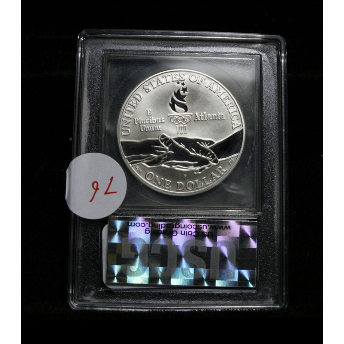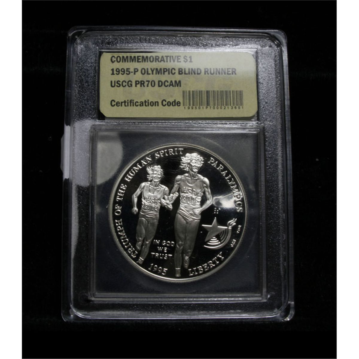The 1995 Paralympics Silver Dollar was issued was part of an extensive program of commemorative coins for the XXVI Olympiad held in Atlanta, Georgia. There were a total of sixteen different coins issued for the program over the course of two years. PCGS lists PR70 DCAM as $1300 This Perfect coin is graded PR70 Deep cameo by USCG. Estimated Value $350.