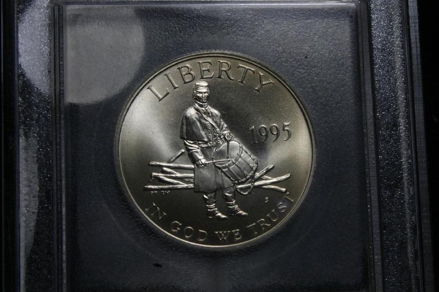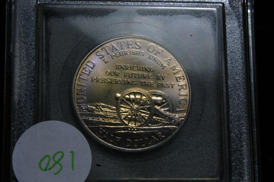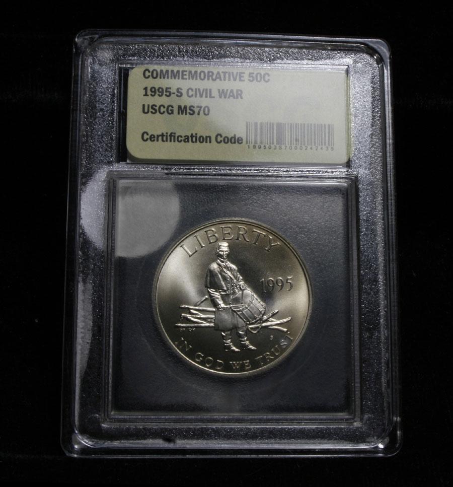 Stunning Reverse Toned Example, absolutely beautiful. Proof Half Dollar Civil War Battlefield Commemorative, The Obverse sculpted by famed Civil war artist Don Troiani. The 1995 Civil War Battlefields Half Dollar was to commemorative 100 years of Civil War battlefields preservation. This is dated from the establishment of the Gettysburg National Military Park in 1895. Encapsulated and Graded PF70 DCAM by USCG. PCGS lists PR70 at $2000 Estimated Value $500