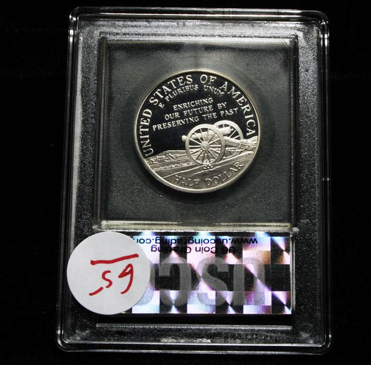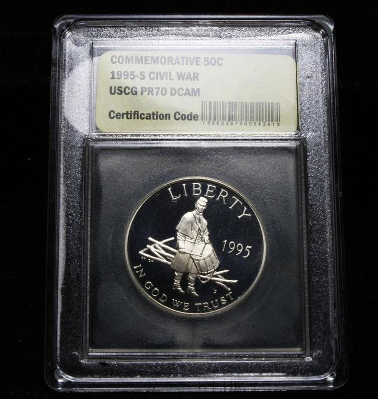 Proof Half Dollar Civil War Battlefield Commemorative, The Obverse sculpted by famed Civil war artist Don Troiani. The 1995 Civil War Battlefields Half Dollar was to commemorative 100 years of Civil War battlefields preservation. This is dated from the establishment of the Gettysburg National Military Park in 1895. Encapsulated and Graded PF70 DCAM by USCG. PCGS lists PR70 at $2000 Estimated Value $300