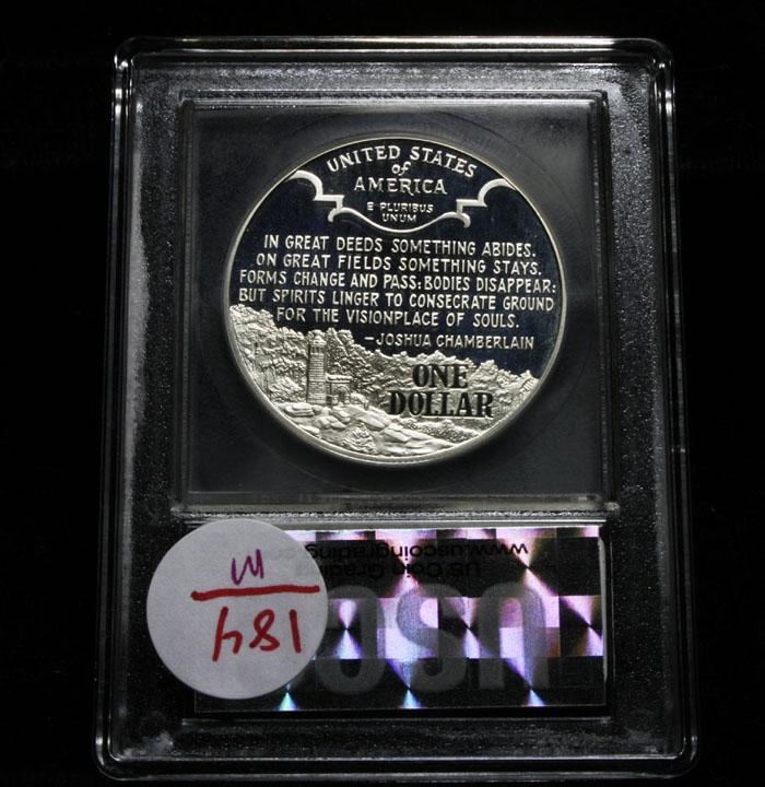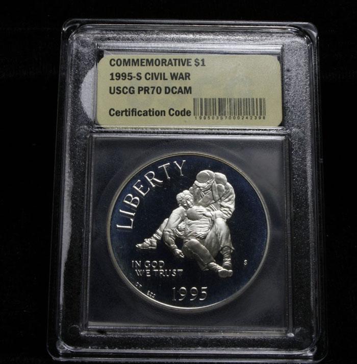 The 1995 Civil War Battlefields Silver Dollar was to commemorative 100 years of Civil War battlefields preservation. This is dated from the establishment of the Gettysburg National Military Park in 1895. Encapsulated and Graded PF70 DCAM by USCG. PCGS lists the PR70 at $2100 Very Elusive. Estimated Value $400