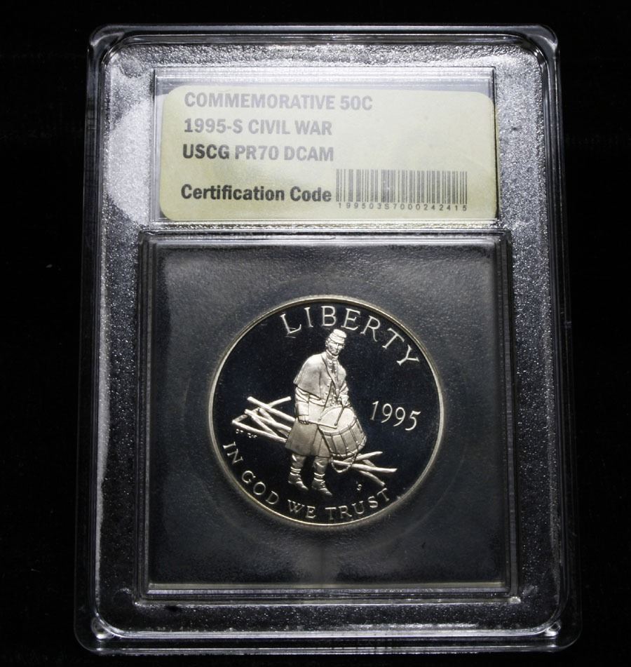 1995-s Civil War Battlefields Proof Modern Commem Half Dollar 50c Graded GEM++ Proof Deep Cameo by USCG. Proof Half Dollar Civil War Battlefield Commemorative, The Obverse sculpted by famed Civil war artist Don Troiani. The 1995 Civil War Battlefields Half Dollar was to commemorative 100 years of Civil War battlefields preservation. This is dated from the establishment of the Gettysburg National Military Park in 1895. Encapsulated and Graded Perfection Gem+++ Proof DCAM by USCG.