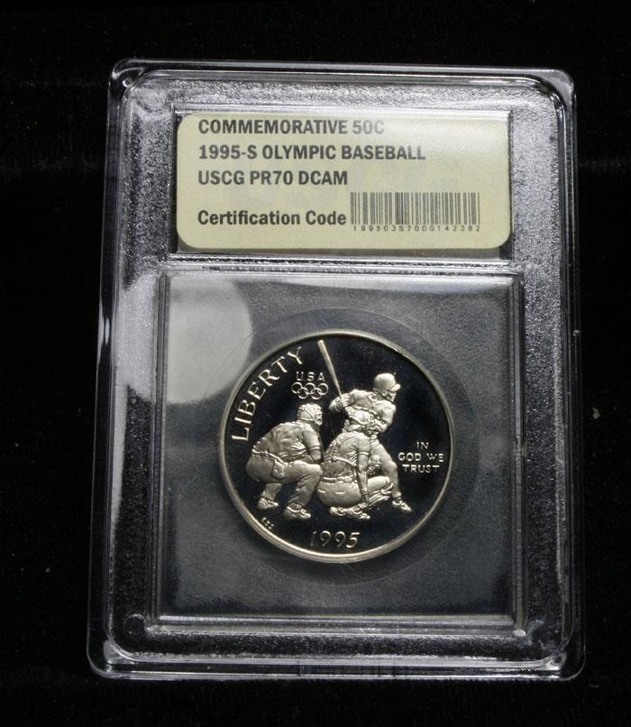The 1995 Olympic Baseball Half Dollar was issued as one of two commemorative half dollar coins for the Atlanta XXVI Olympiad Summer Games. PCGS lists a PR70 DCAM at $1500. This example is Graded PR70 DCAM by USCG. Estimated Value $225