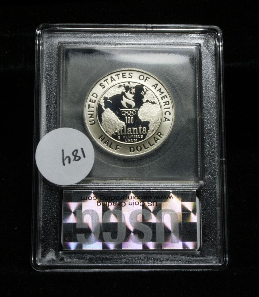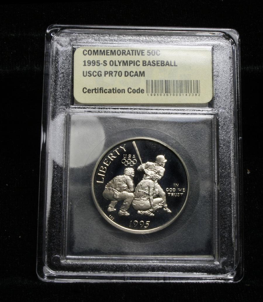 The 1995 Olympic Baseball Half Dollar was issued as one of two commemorative half dollar coins for the Atlanta XXVI Olympiad Summer Games. PCGS lists a PR70 DCAM at $1500. This example is Graded PR70 DCAM by USCG. Estimated Value $225