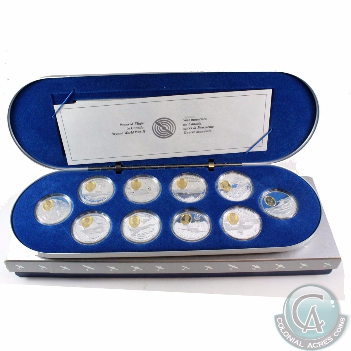 1995 to 1999 Canada Aviation sterling sivler $20 Series Two Powered Flight in Canada: Beyond World War II Complete 10-coin Set with Deluxe Case (as is typical of this set, the outer cardboard box is lightly worn) 10pcs