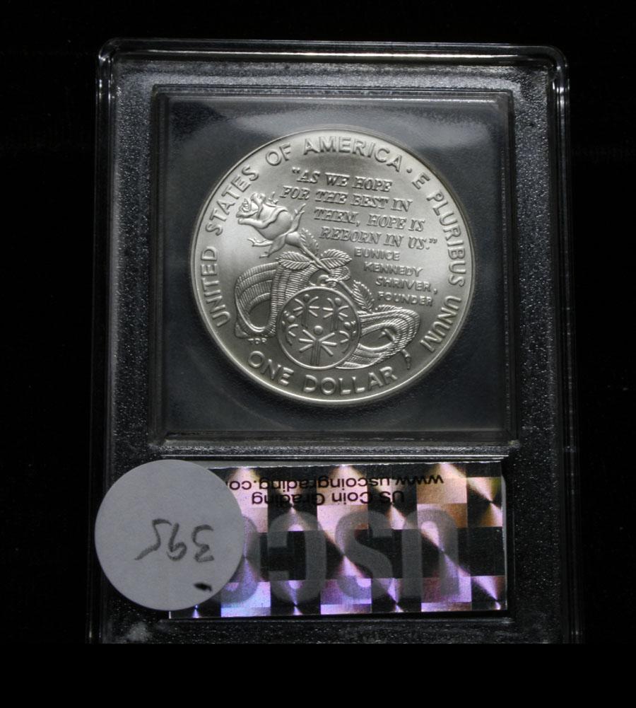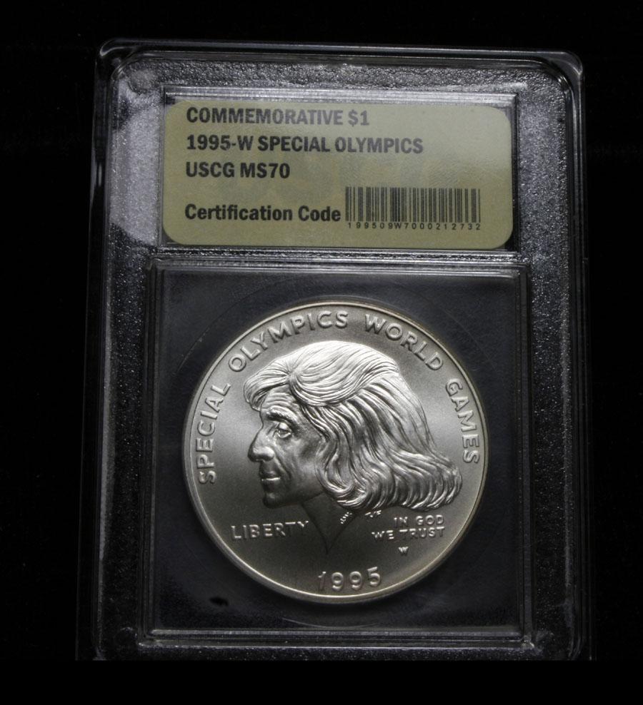 The 1995 Special Olympics World Games Silver Dollar was issued to honor the competitions created for people with intellectual disabilities. The obverse is a portrait of Eunice Kennedy Shriver. At the time, she was the first living female depicted on US coinage PCGS lists PR70 DCAM as $800. This Perfect coin is graded ms70 by USCG. Estimated Value $250.