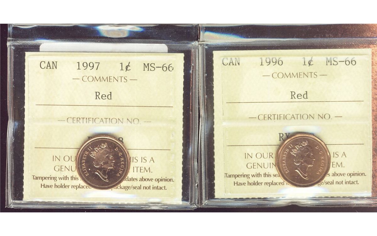 1996 1¢ & 1997 ICCS MS66RD. Lot of 2 coins.