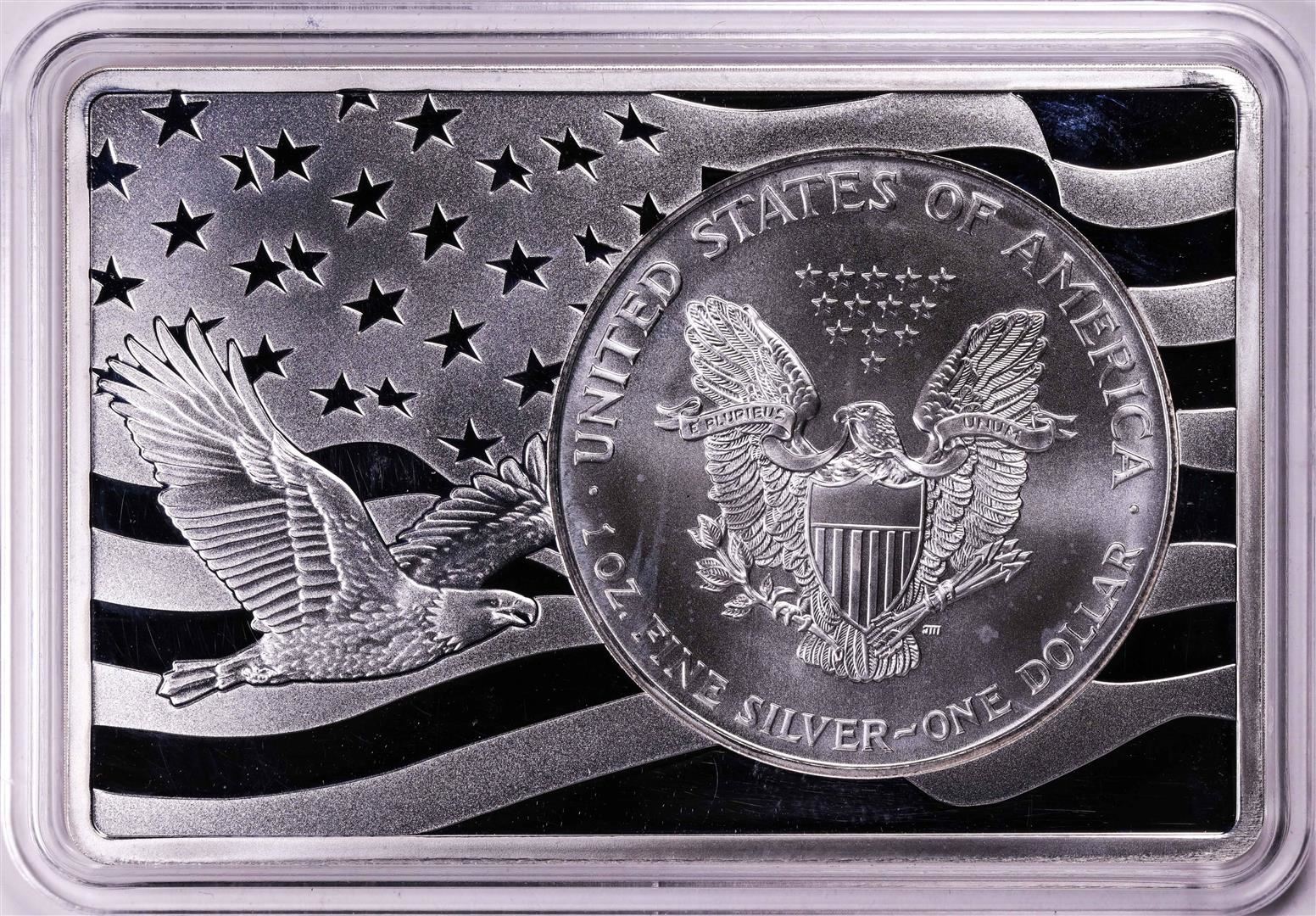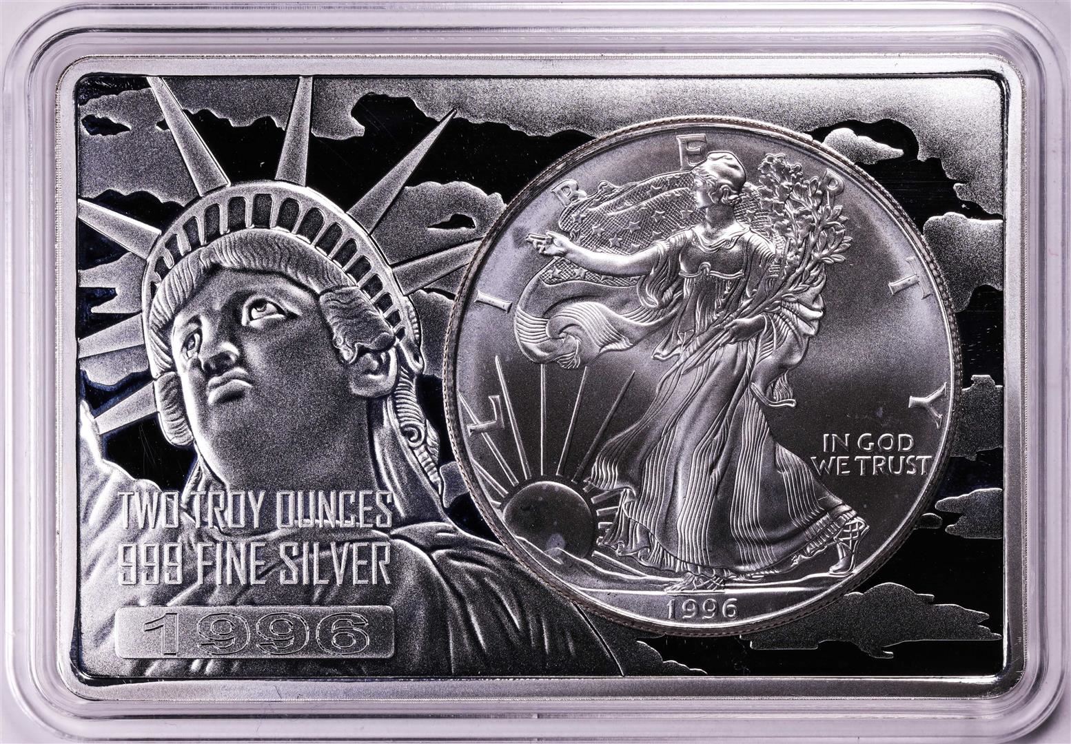 One 1996 $1 American Silver Eagle Coin & 2oz Silver Bar Set.