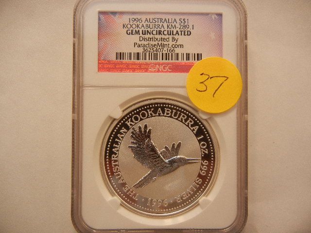 1996 $1 Australian Kookaburra, KM-289, GEM UNC, .999 Fine Silver, 1 Troy Oz., Graded by NGC