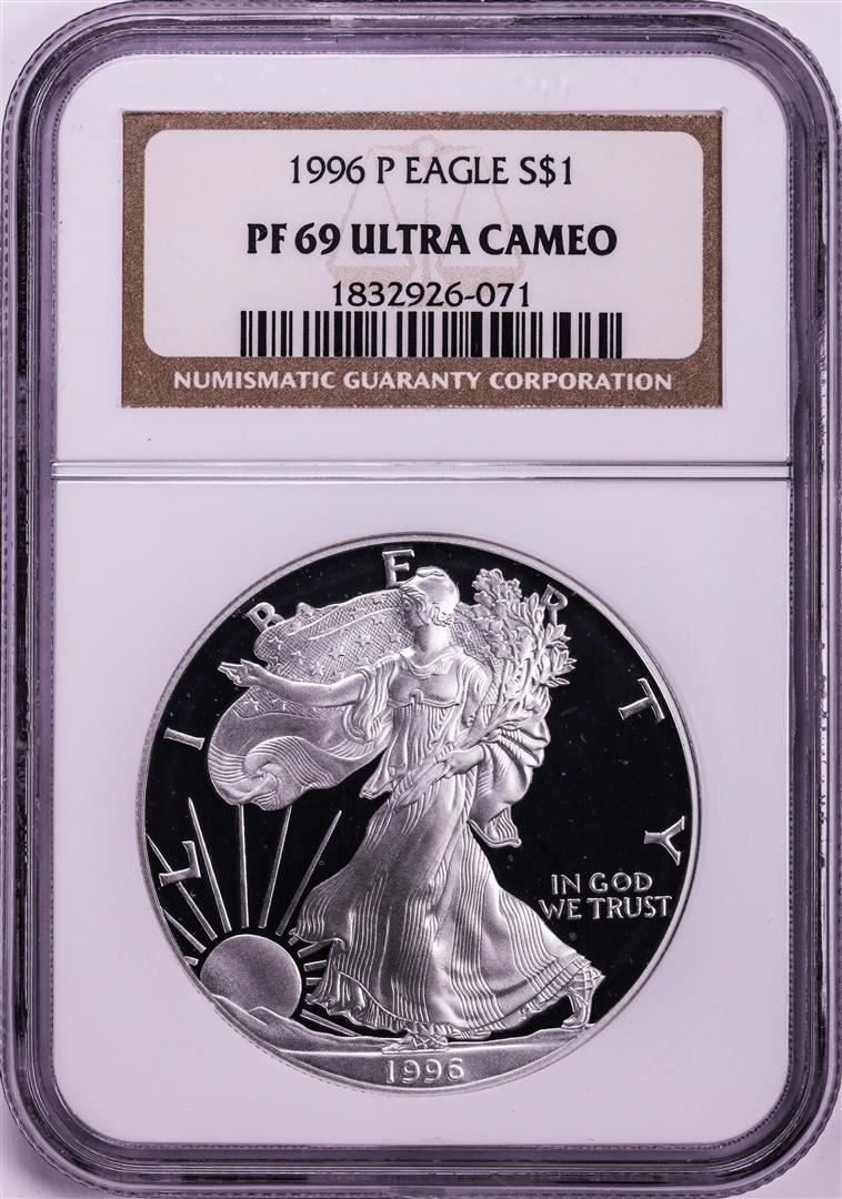 One 1996 $1 Proof American Silver Eagle Coin NGC PF69 Ultra Cameo. NGC Certified.