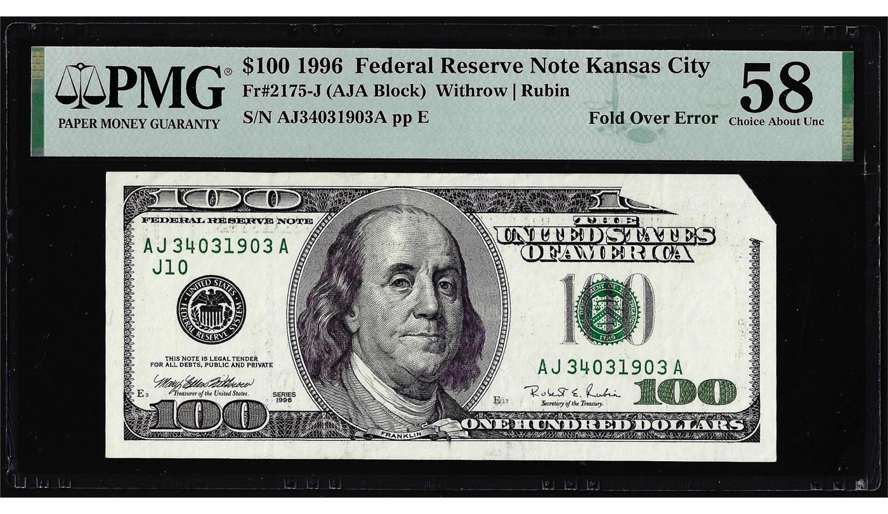 One 1996 $100 Federal Reserve Fold Over Error Note Fr.2175-J PMG Choice About Unc 58. PMG Certified.