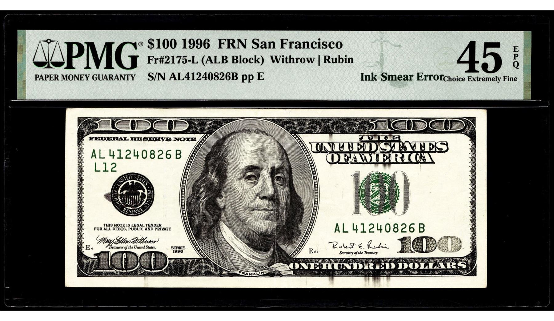 One 1996 $100 Federal Reserve Ink Smear Error Note Fr.2175-L PMG Ch. Extremely Fine 45EPQ. PMG Certified.
