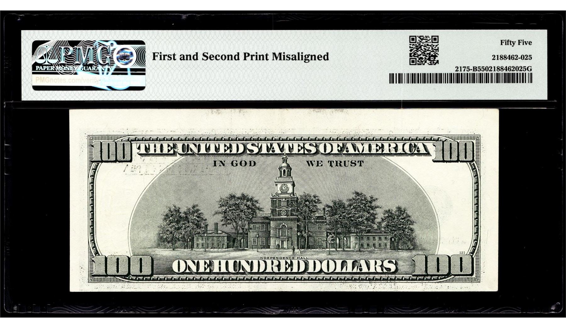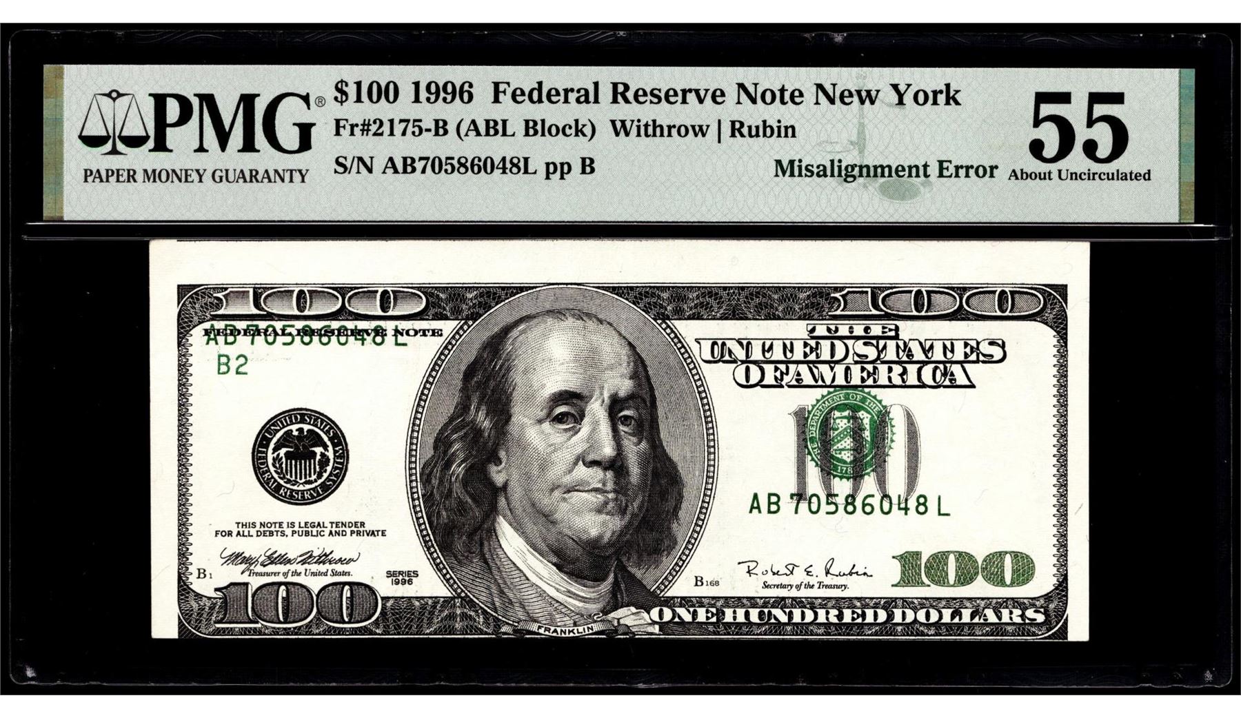 One 1996 $100 Federal Reserve Misalignment Error Note Fr.2175B PMG About Uncirculated 55. PMG Certified.