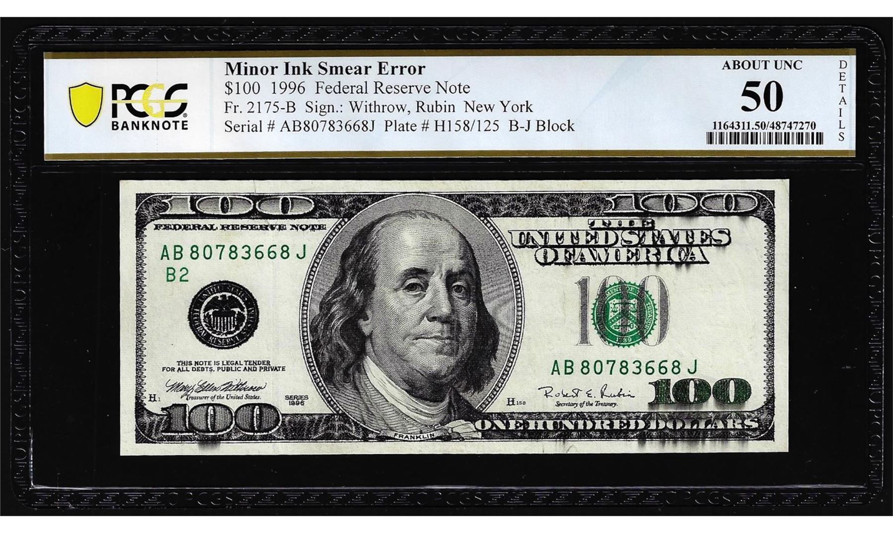 One 1996 $100 Federal Reserve Note Minor Ink Smear Error PCGS About Unc 50 Details. PCGS Graded.