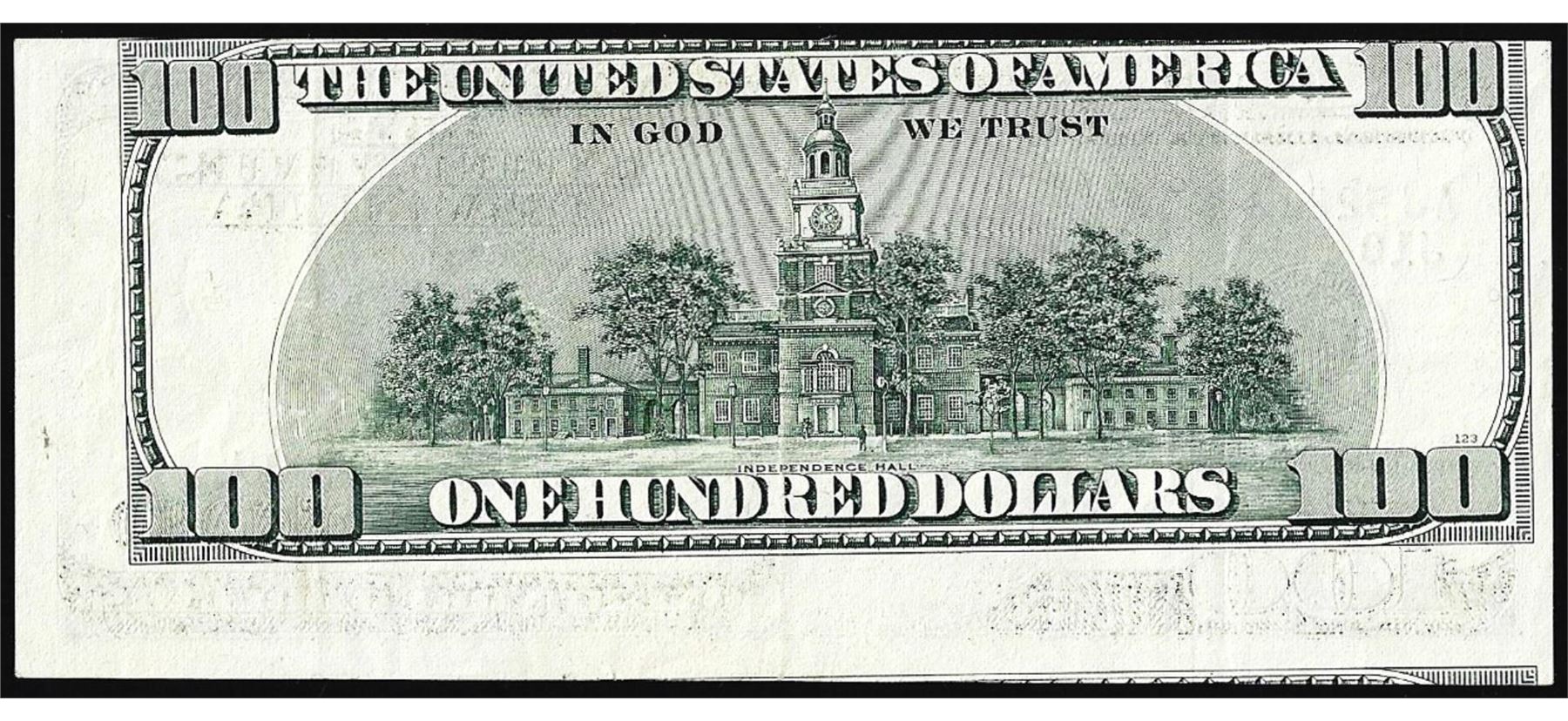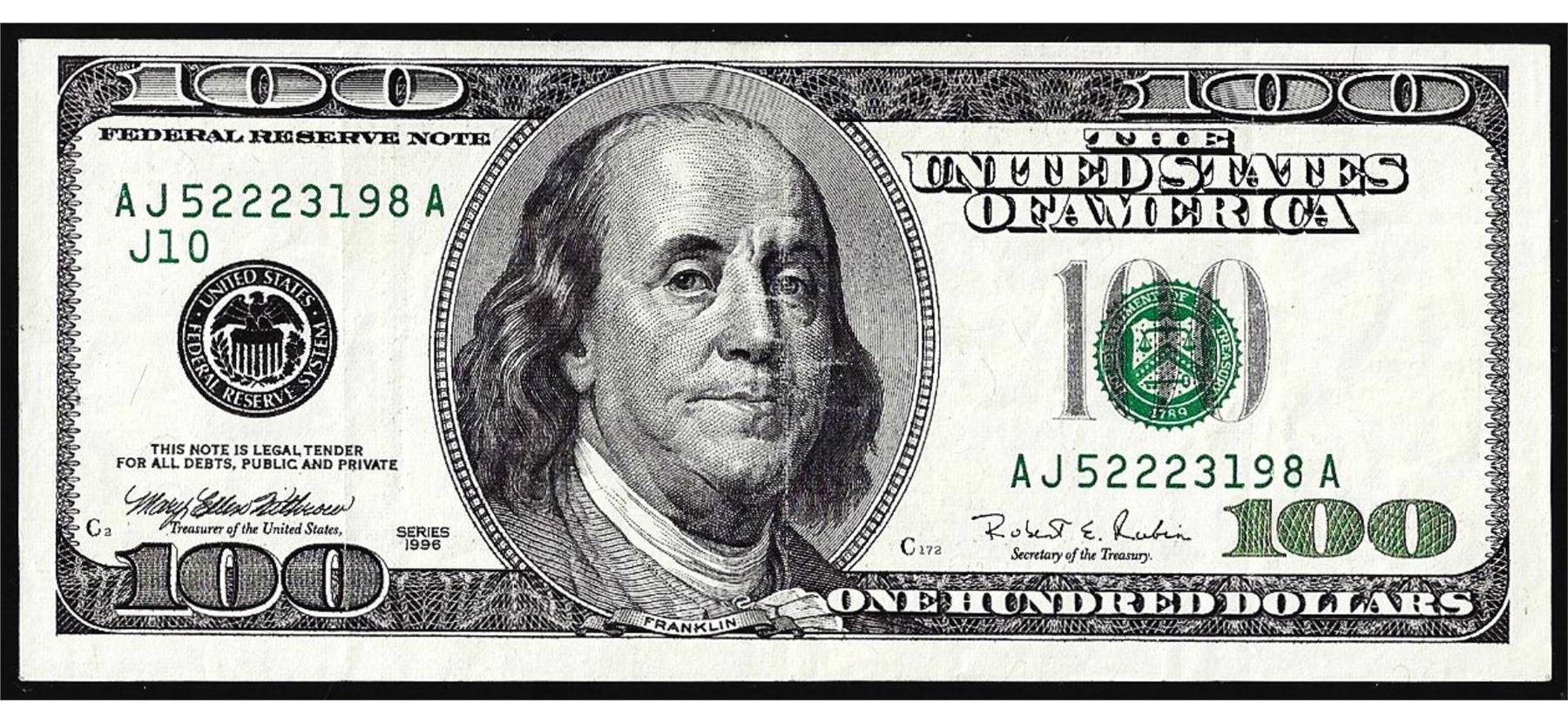 One 1996 $100 Federal Reserve Note Misaligned Back Print Error.