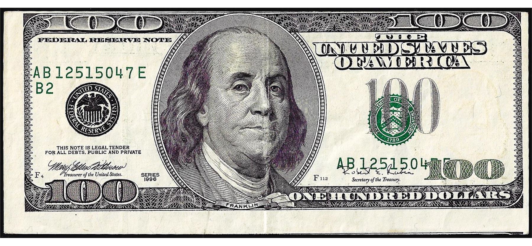 One 1996 $100 Federal Reserve Note Misaligned Overprint Error.