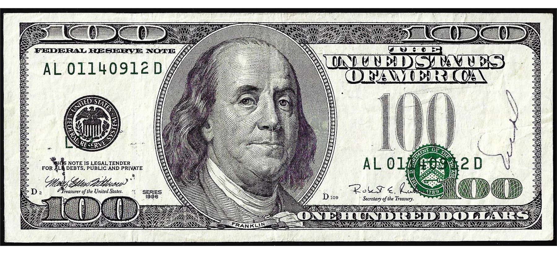 One 1996 $100 Federal Reserve Note Misaligned Overprint Error.
