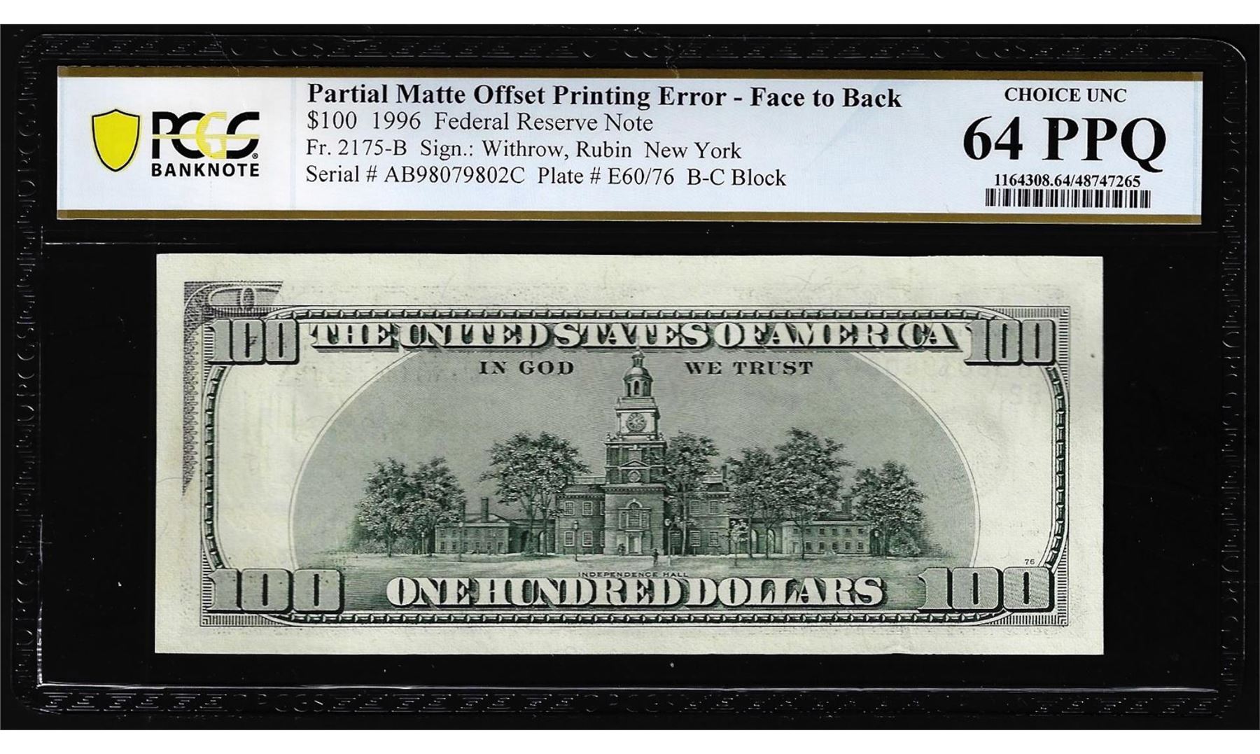 One 1996 $100 Federal Reserve Note Partial Matte Offset Error PCGS Choice Unc 64PPQ. PCGS Graded.