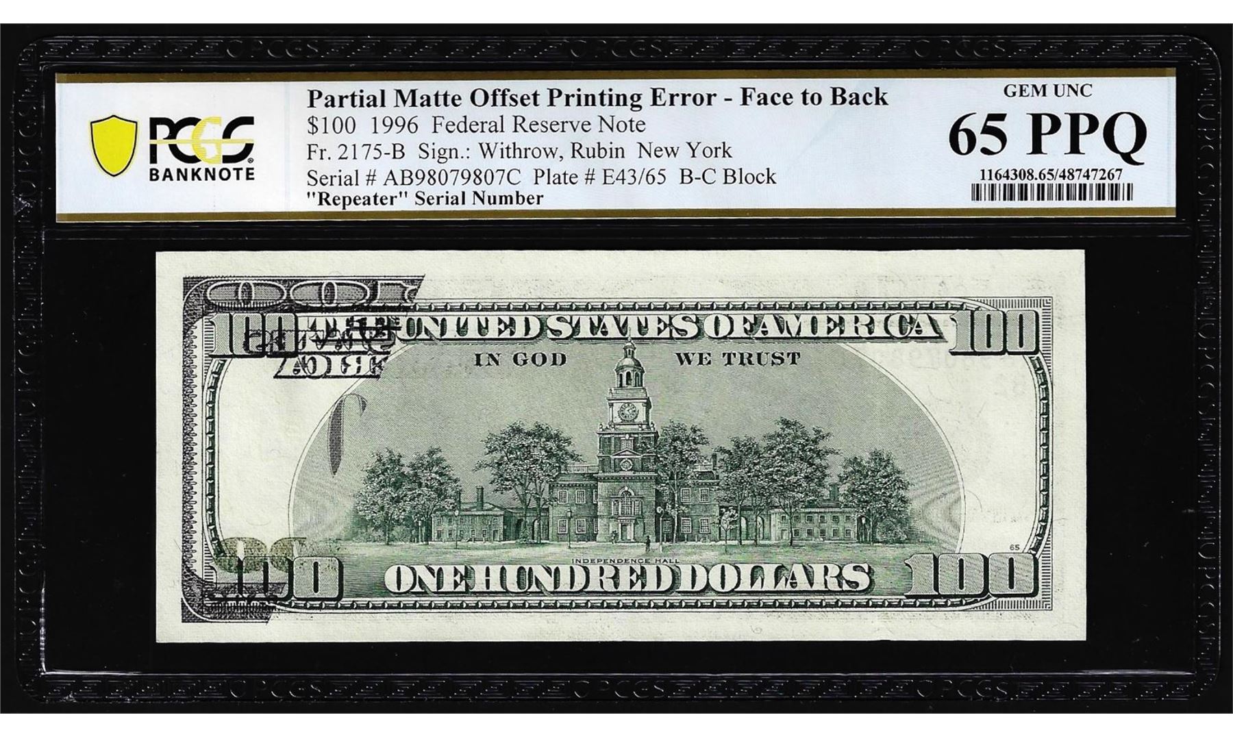 One 1996 $100 Federal Reserve Note Partial Offset Error PCGS Gem Unc 65PPQ Repeater Serial. PCGS Graded.