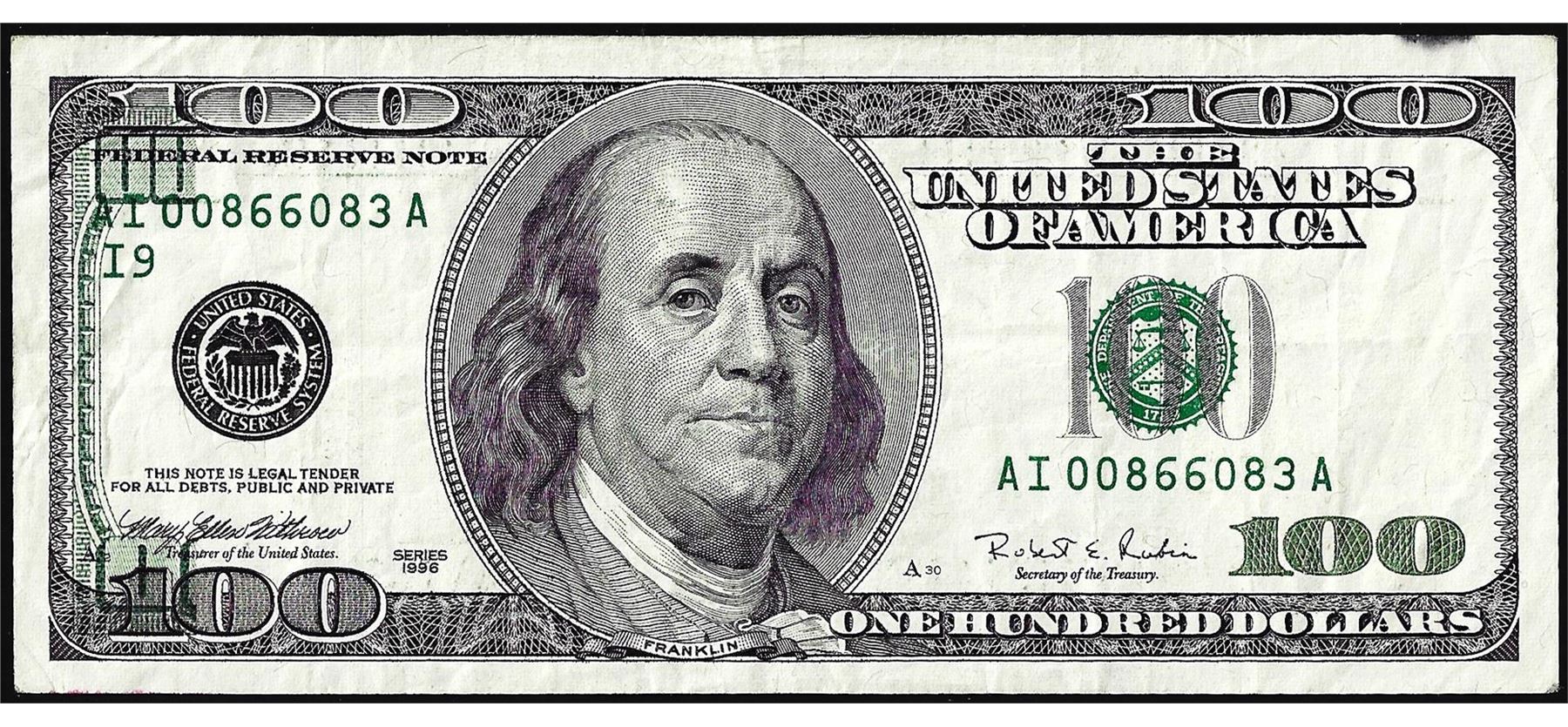 One 1996 $100 Federal Reserve Note Partial Offset Error.