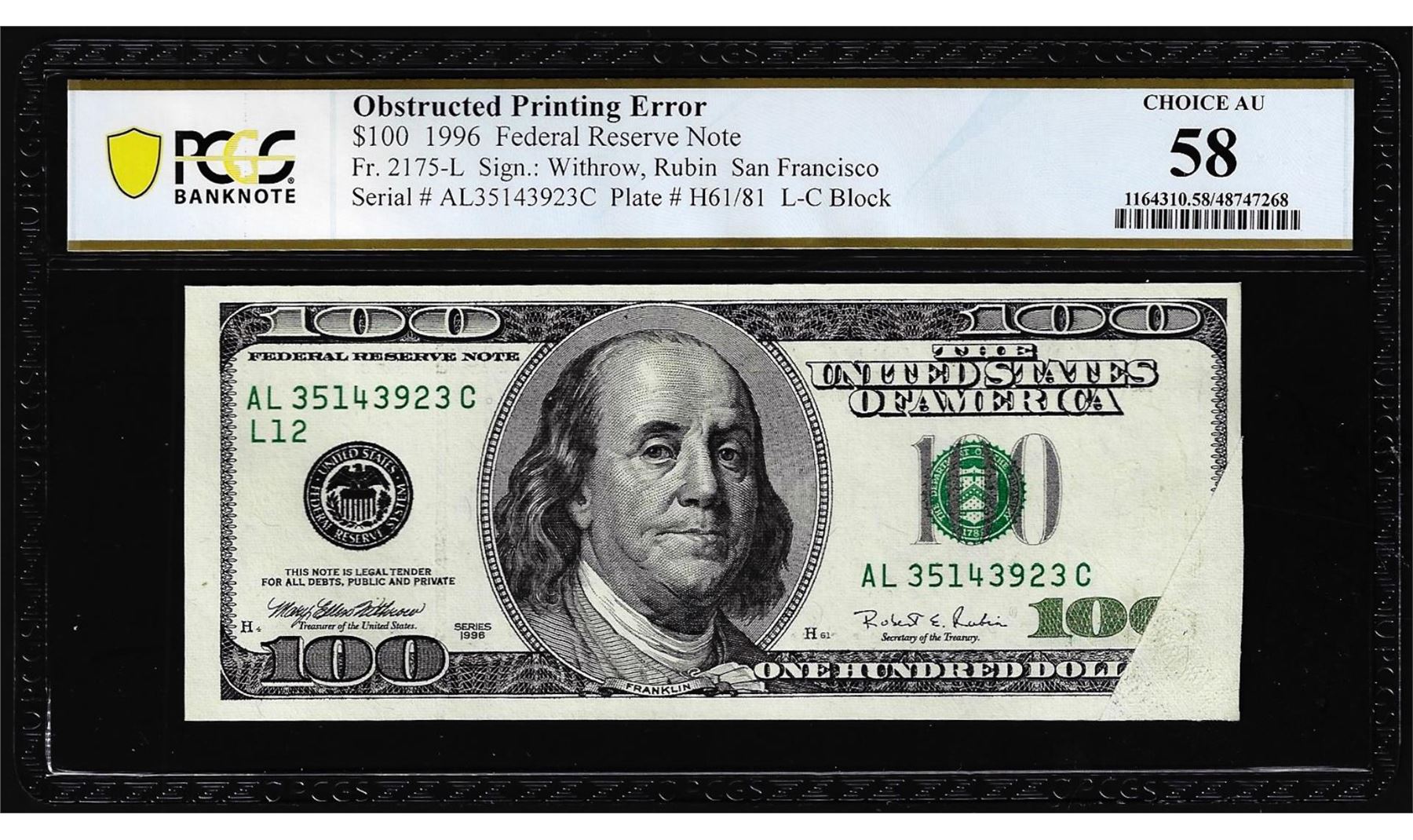 One 1996 $100 Federal Reserve Note SF Obstructed Printing Error PCGS Choice AU 58. PCGS Graded.