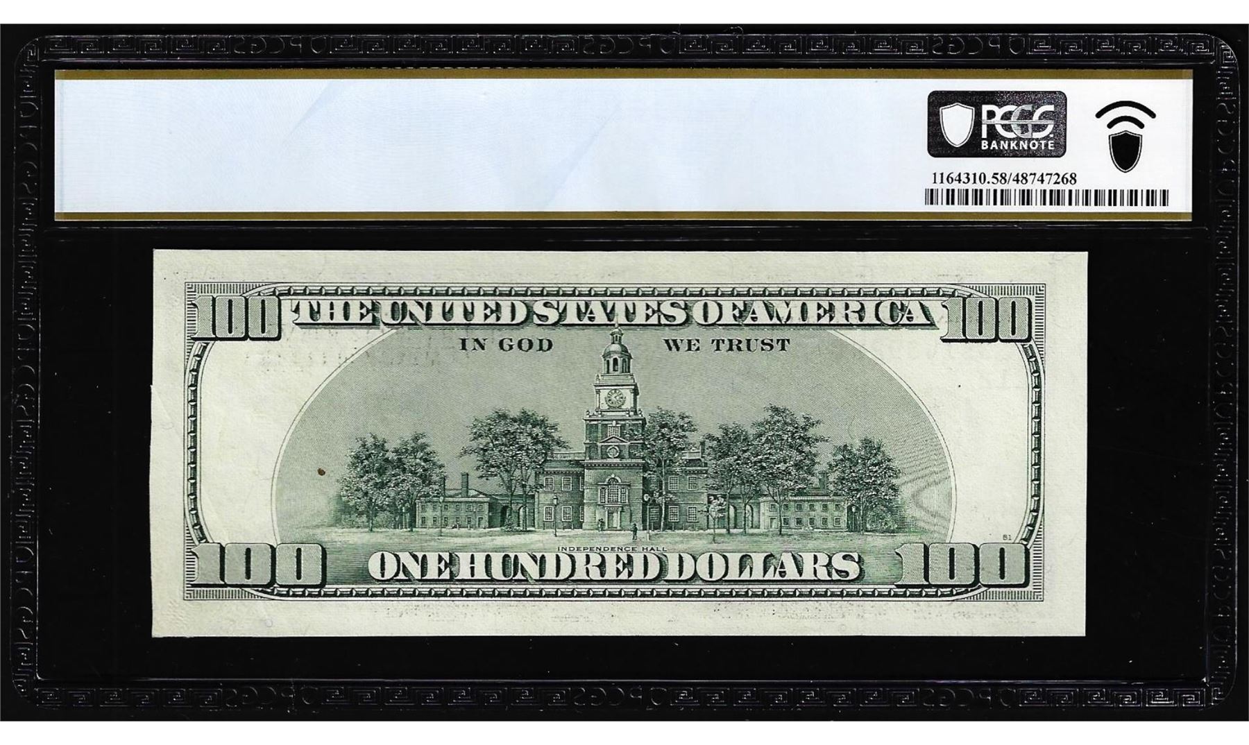 One 1996 $100 Federal Reserve Note SF Obstructed Printing Error PCGS Choice AU 58. PCGS Graded.