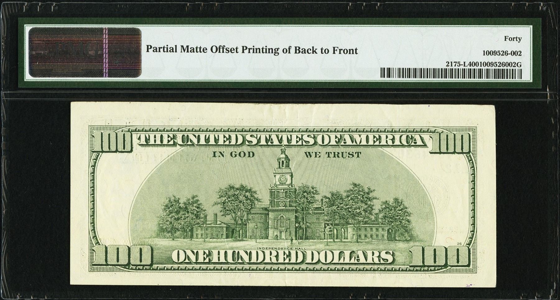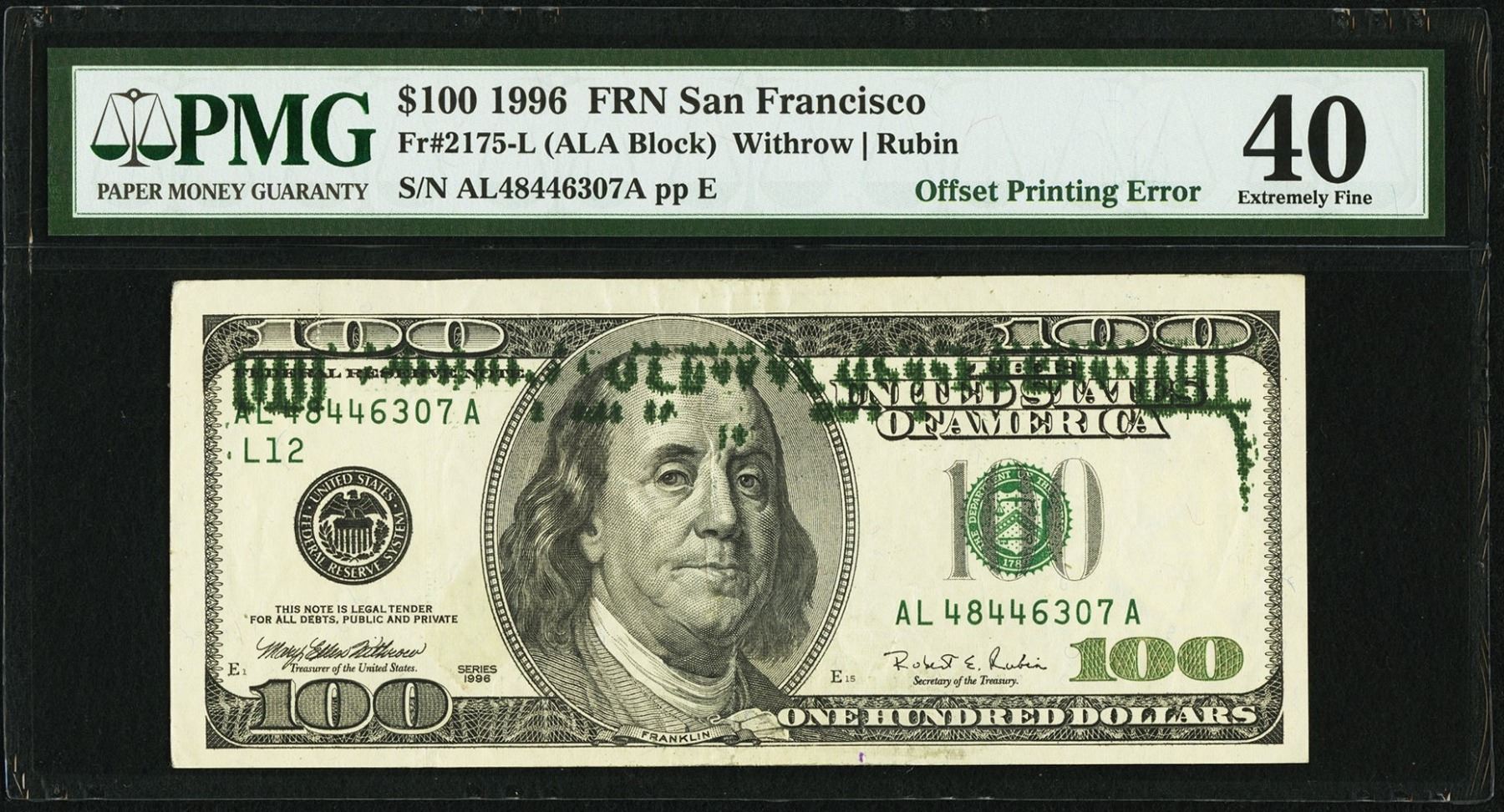 One 1996 $100 San Francisco Federal Reserve ERROR Note PMG 40.