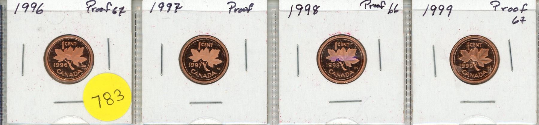 1996, 1997, 1998, 1999 Canadian Proof Like One Cent Coins.