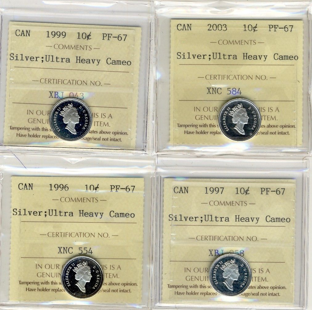 1996, 1997, 1999, 2003 10 Cents, ICCS PF67; Four coins Ultra Heavy Cameo.