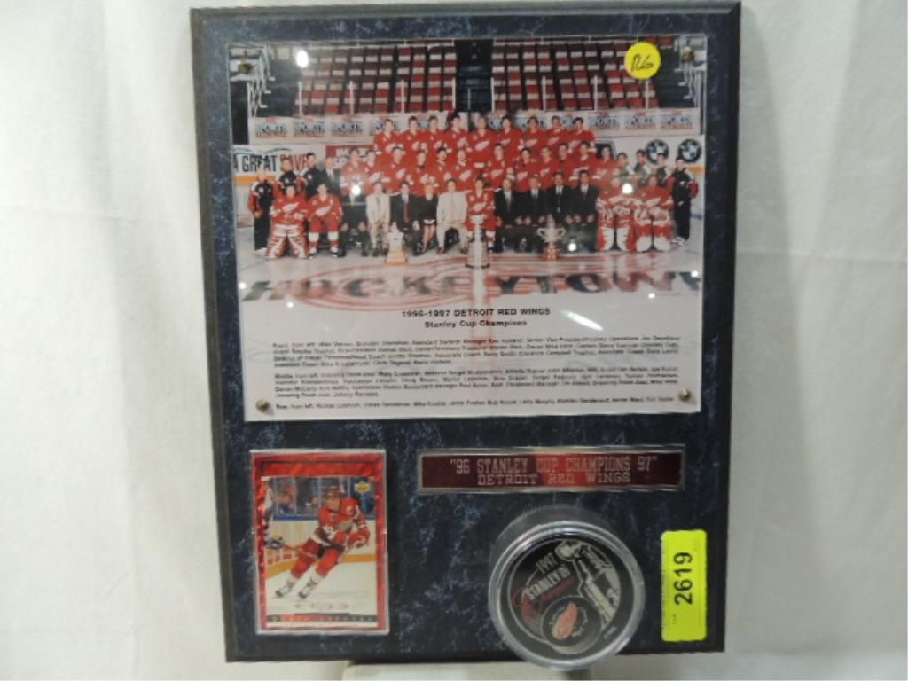1996-1997 DETROIT RED WINGS STANLEY CUP CHAMPIONS PLAQUE. TEAM PHOTO HOCKEY PUCK STEVE YZERMAN HOCKEY PLAYER CARD. AS SHOWN. SEE PHOTO FOR MORE DETAILS.