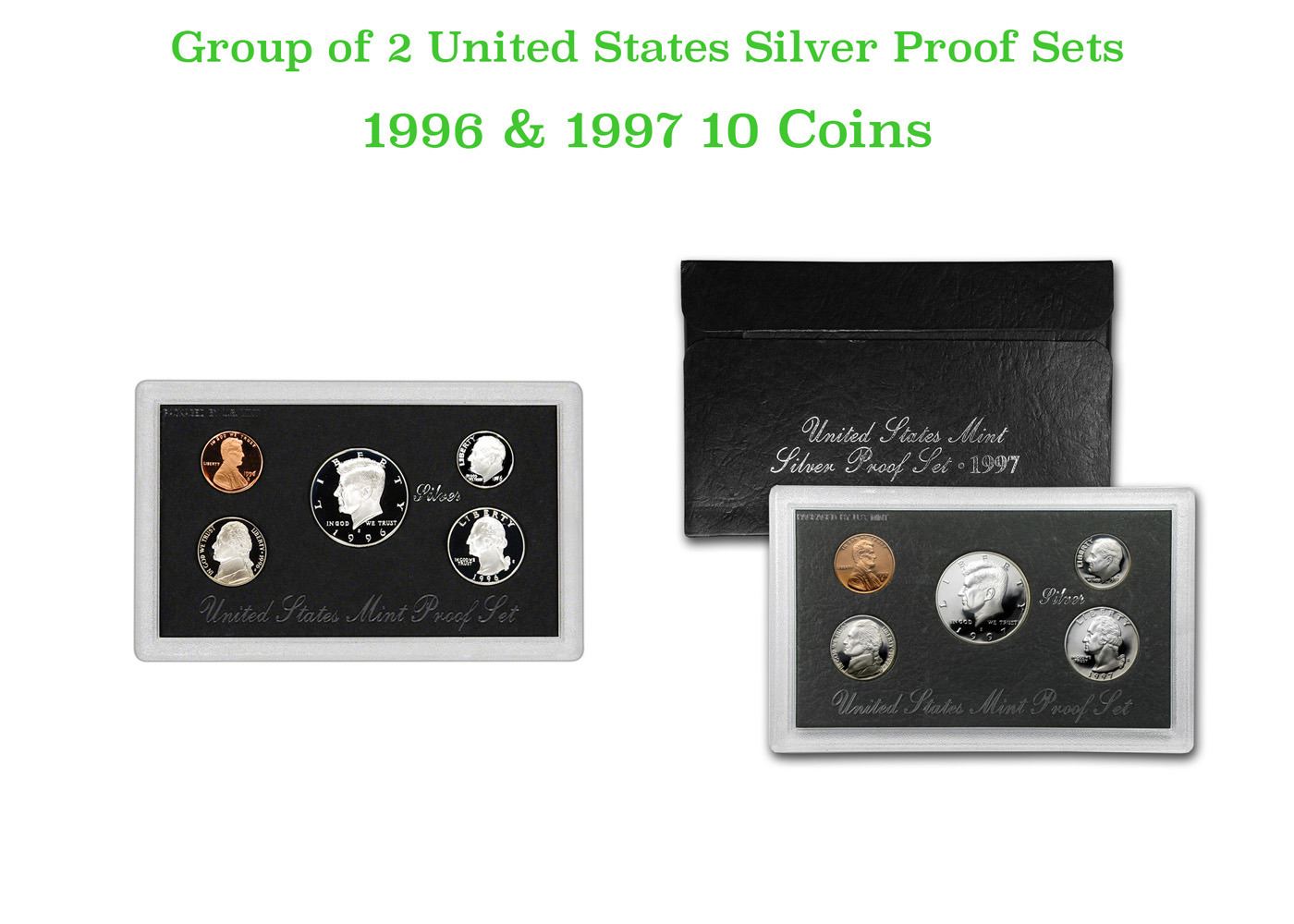 1996-1997 United States Mint Silver Proof Set. 10 Coins Inside.. Group of 2 United States Proof Sets 1996-1997 10 coins. All coins included in the set were struck at the San Francisco Mint. Each set contains a 90% silver Half Dollar, a 90% Silver Quarter, a 90% Silver Dime, a Jefferson Nickle and a Lincoln penny. Harder Set. The packaging for the 1996-1997 Silver Proof Set was themed in black, but otherwise similar to the packaging for the regular set. The coins were placed in individual spaces in a black cardboard. This was sealed within a plastic lens with the word “Silver” imprinted. The outer box was black and had silver printing “United States Mint Silver Proof Set 199_”.
