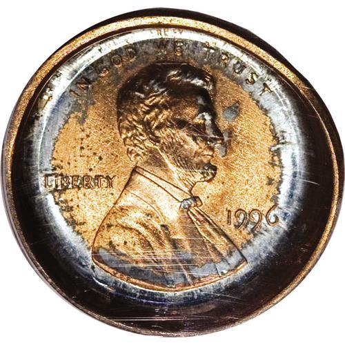 <B>1996 1C Lincoln Cent--Deep Die Cap Obverse--MS64 Red PCGS.</B></I> A struck cent (not the present piece) failed to eject from the dies. A planchet (to become the present lot) was fed between the obverse die and the struck cent. The strike gave the present piece a brockage reverse, and forced the obverse partly around the edge of the obverse die. Additional strikes caused the cent to further wrap around the obverse die, while the brockage reverse image expanded and distorted. Incused and reversed portions of the date and LIBERTY are still legible on the reverse. Some of the zinc interior has penetrated the copper plating. The cap is sufficiently deep that it can barely fit within the standard PCGS holder.<BR><BR><b>Shipping:</b> Coins & Currency (<a target="_blank" href="http://www.heritageauctions.com/common/shipping.php">view shipping information</a>)