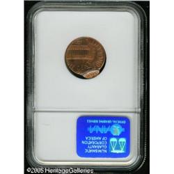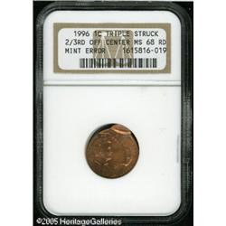 <B>1996 1C Lincoln Cent--Triple Struck, Second and Third Strikes Off Center--MS68 Red NGC.</B></I> The first strike was normal. The second (or third) strike is approximately 20% off center toward 7 o'clock, at 5 o'clock relative to the first strike. The third strike (or the second, no way to know for sure since the off center strikes do not overlap) is 95% off center toward 1 o'clock, at 9 o'clock relative to the first strike. Lot:10892
