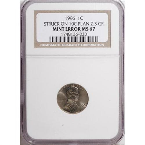<B>1996 1C Lincoln Cent--Struck on Clad Dime Planchet--MS67 NGC.</B></I> 2.3 gm. Faint tan color graces this lustrous Superb Gem, which is well struck despite the wrong planchet combination. The tops of STATES OF AMERICA approach the rim, otherwise all design details are intact.<BR><BR><B>Coin Engraver:</B> Victor D. Brenner<BR><BR><b>Shipping:</b> Coins & Currency (<a target="_blank" href="http://www.heritageauctions.com/common/shipping.php">view shipping information</a>)