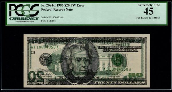 One 1996 $20 ERROR Federal Reserve Note PCGS 45.